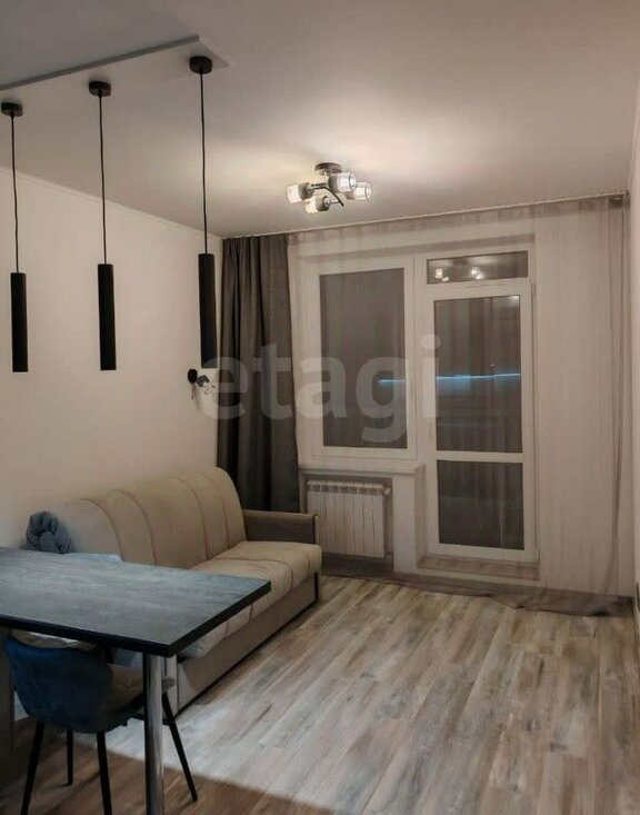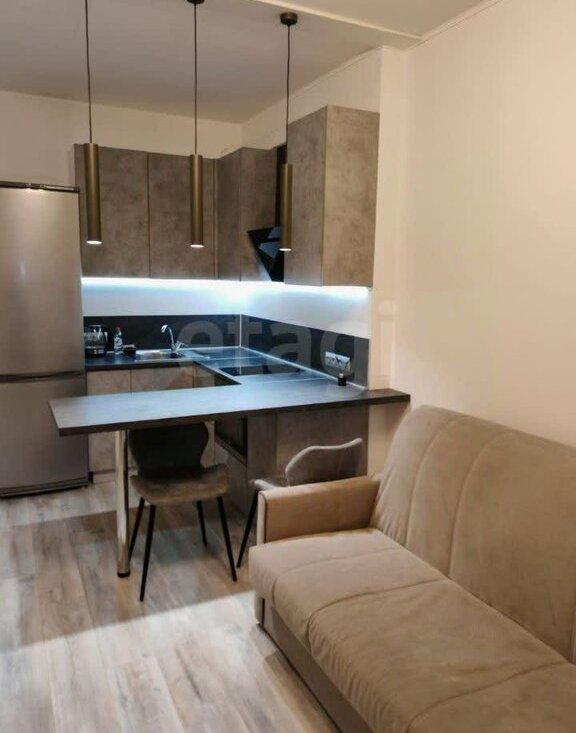 С тудия поделена на зону спальни с диваном и кухню с выходом на застекленную лоджию.