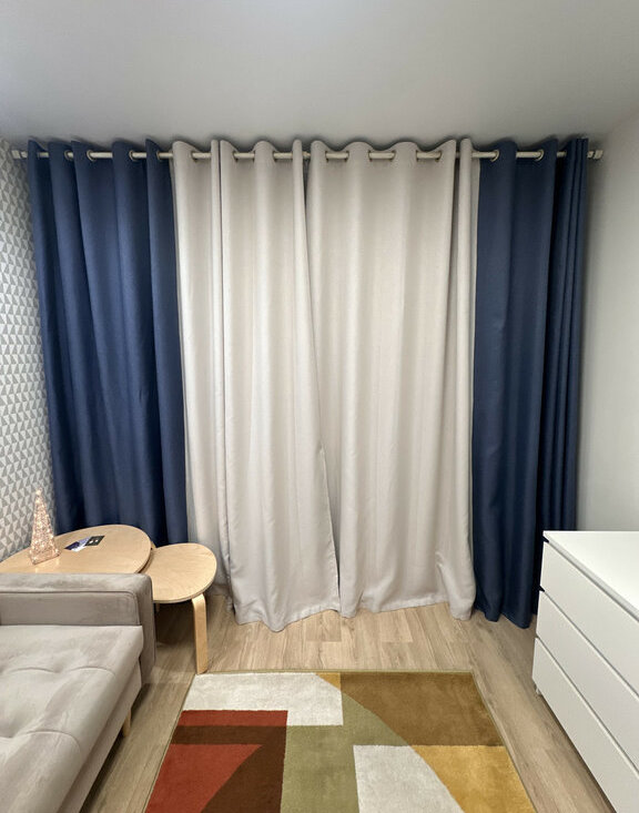 Окна выходят во двор, солнечная сторона, для удобства висят шторы блэкаут.