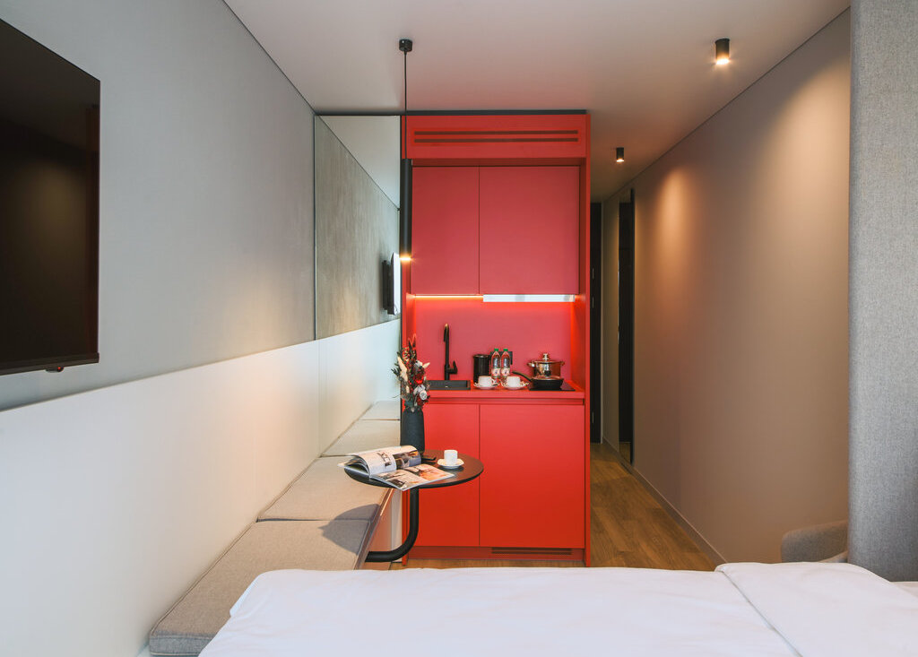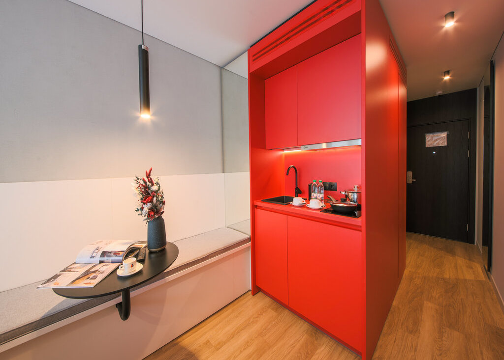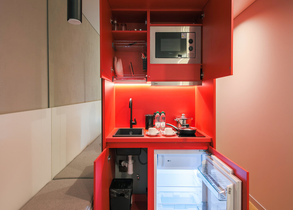 - Кухонная зона с плитой, микроволновкой, чайником, мини-холодильником и набором посуды.