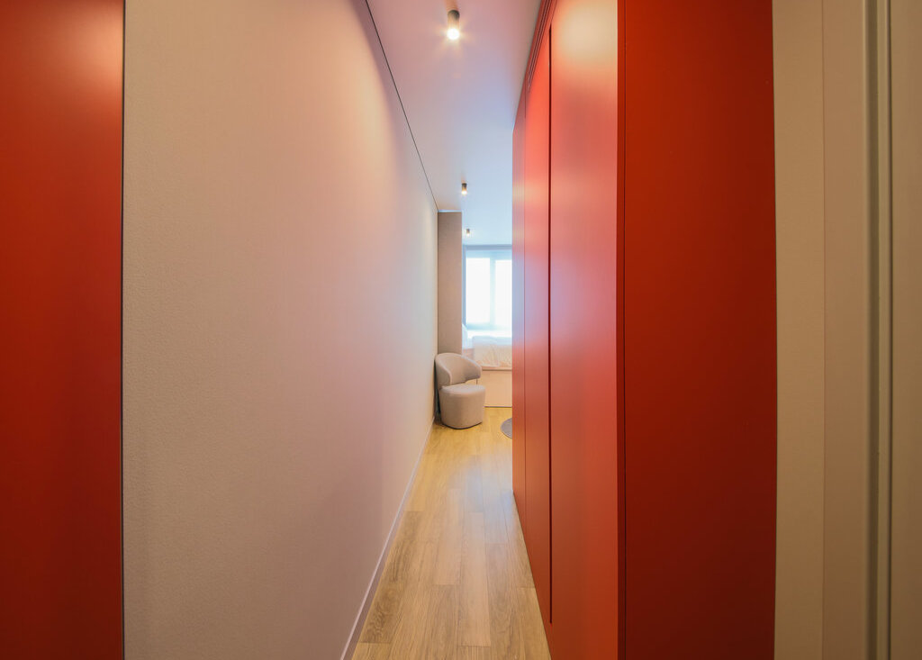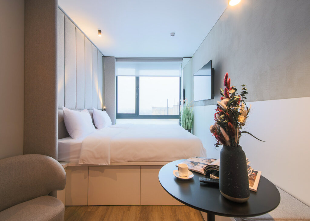 - Полностью меблированное пространство: двуспальная кровать, рабочее место, шкаф, кондиционер.