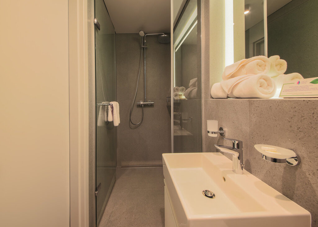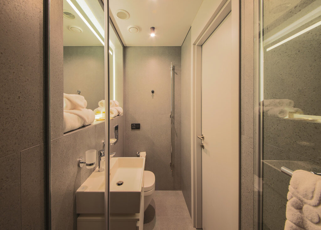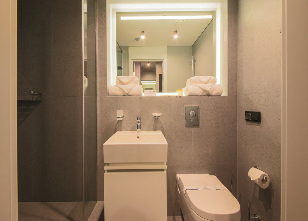 - Современная ванная комната с душевой кабиной и качественной отделкой.