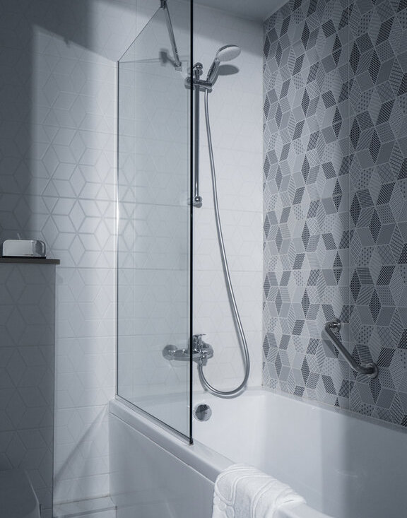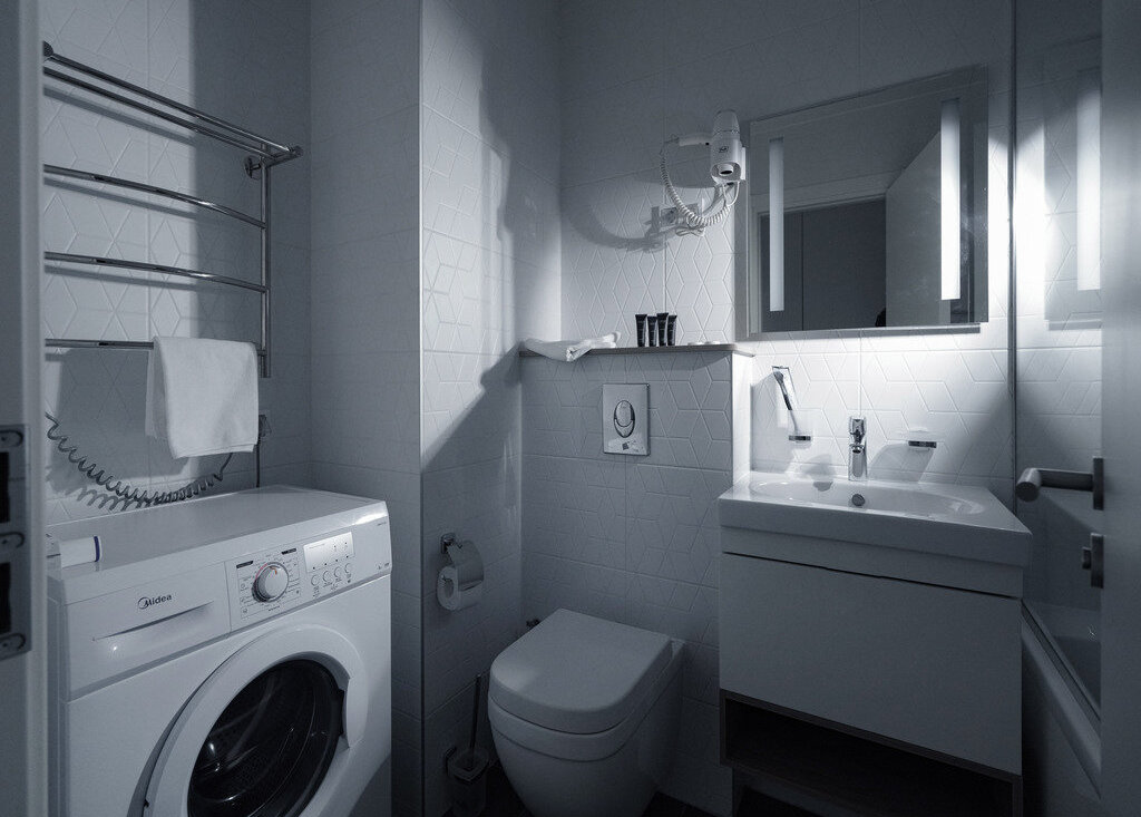 - В ванной комнате установлена сантехника высокого европейского качества и полноценная ванна. Также в номере есть стиральная машина, сушилка для белья, утюг и гладильная доска.
