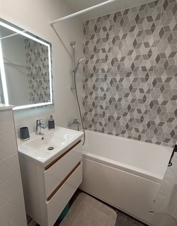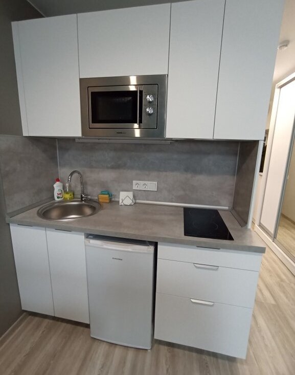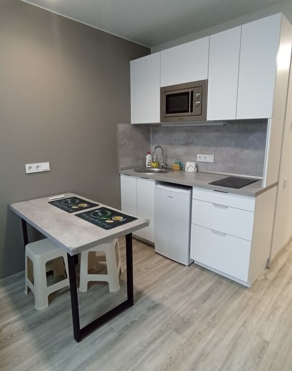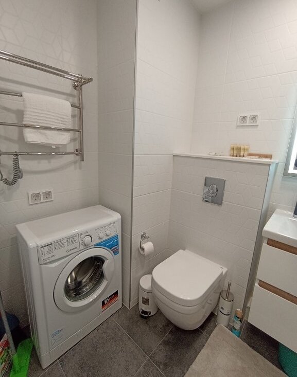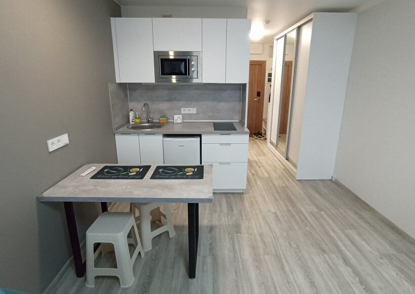 Квартира-студия полностью укомплектована. На кухне микроволновая печь, плита, посуда . В ванной комнате установлена полноценная ванная, вместительная стиральная машина. Есть утюг, гладильная доска, сушилка.