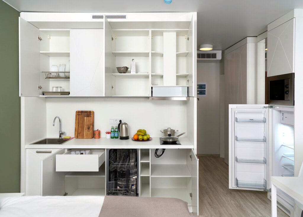 - На кухне — микроволновая печь, плита, посудомоечная машина с капсулой для первой стирки, вся посуда для готовки и питания (от кастрюль до штопора). В части номеров кухня отделена от спальни барной стойкой.