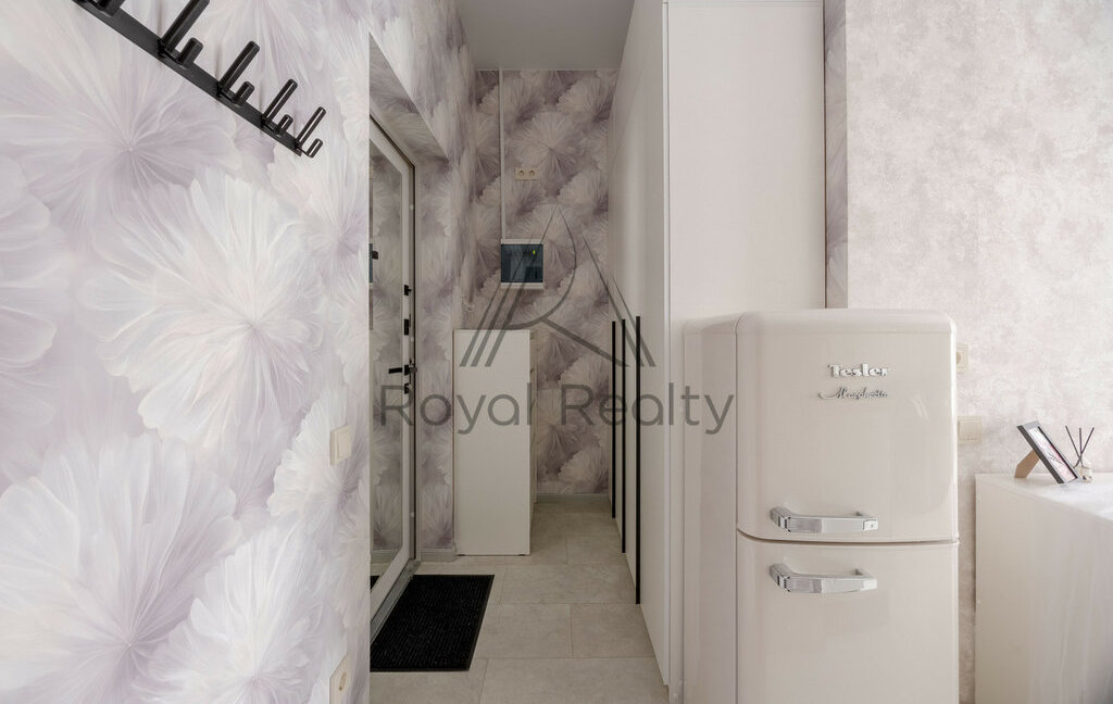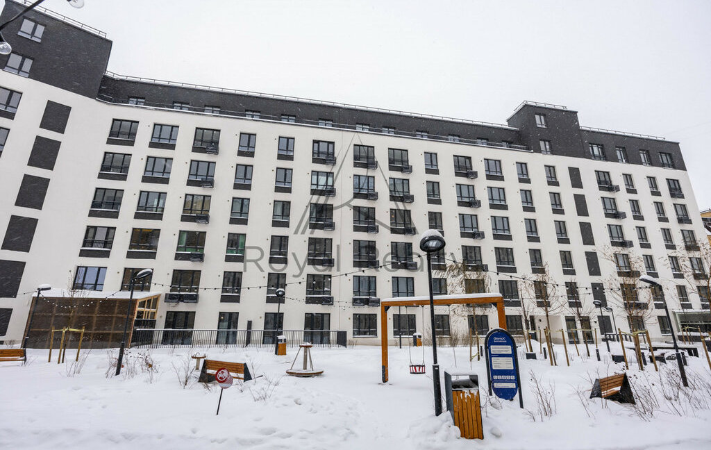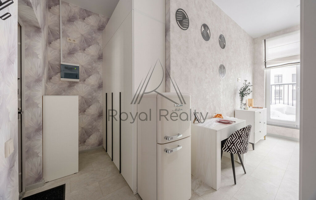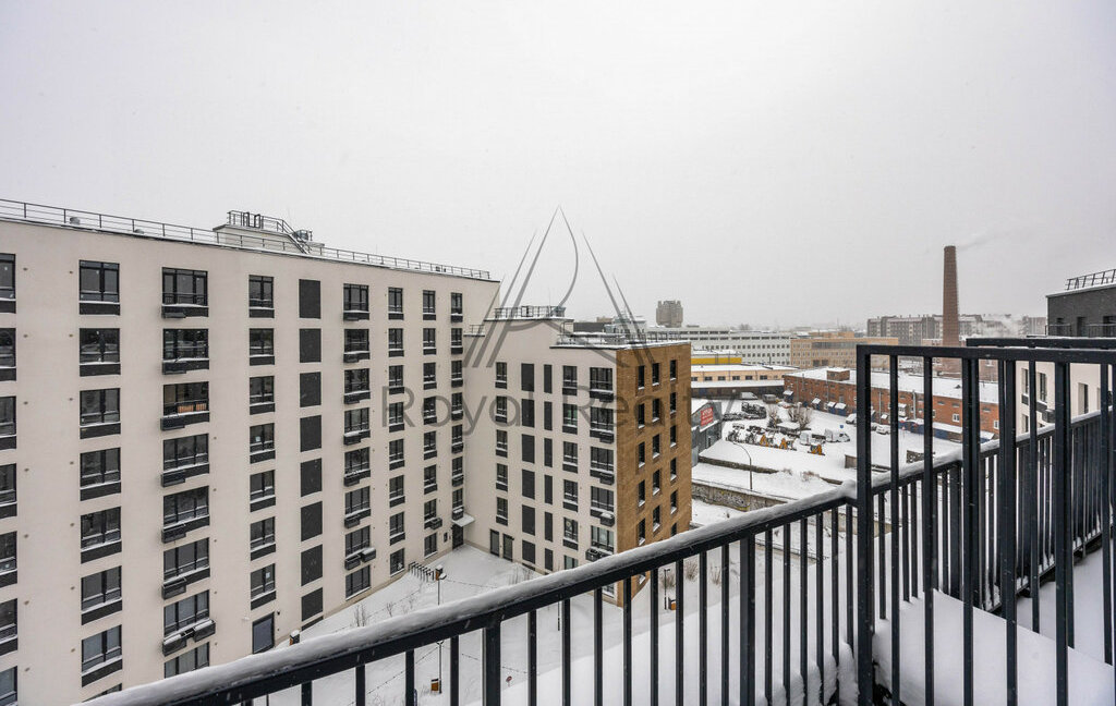 20 м² с собственной террасой, 8 этаж (последний), без соседей сверху, окна выходят в тихий закрытый двор. Солнечная сторона — в квартире всегда много естественного света (фото сделаны в январе).