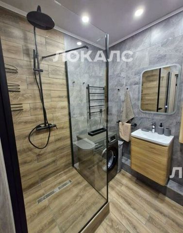 Совмещённый санузел с элегантной душевой кабиной и стильной сантехникой.