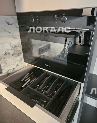 На кухне есть вся необходимая техника (чайник, варочная поверхность, вытяжка, посудомоечная машина, духовой шкаф с функцией СВЧ, встроенный холодильник) и посуда. Вмонтирован дополнительный фильтр питьевой воды.