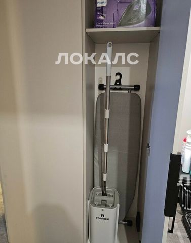 Есть технический шкаф с вертикальным пылесосом, гладильной доской, утюгом.