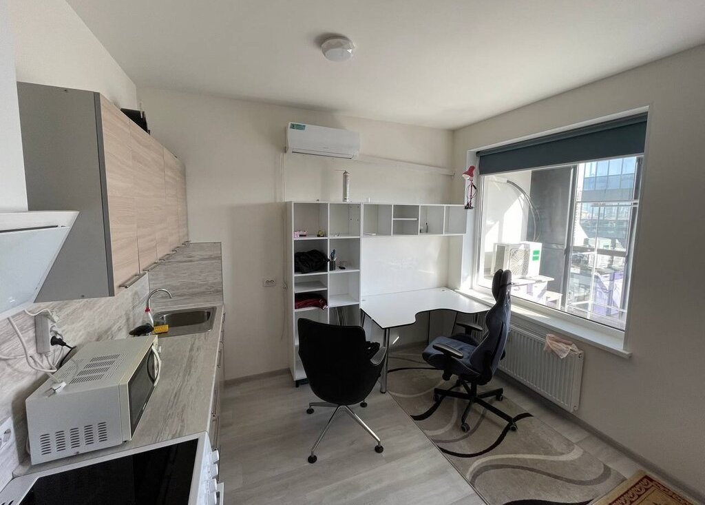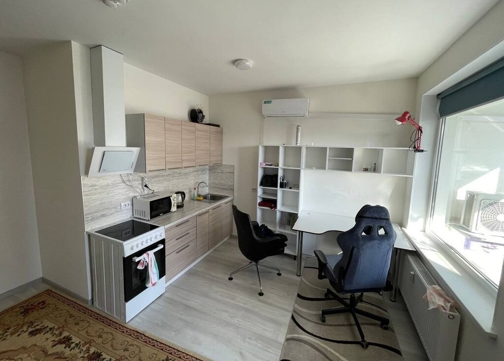 В квартире есть кухонный гарнитур с плитой, духовкой, вытяжкой, микроволновкой и чайником. В комнате есть холодильник, раскладной диван на два спальных места, компьютерный стол со стульями для работы дома.