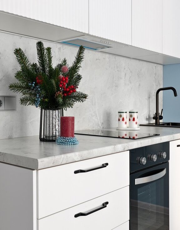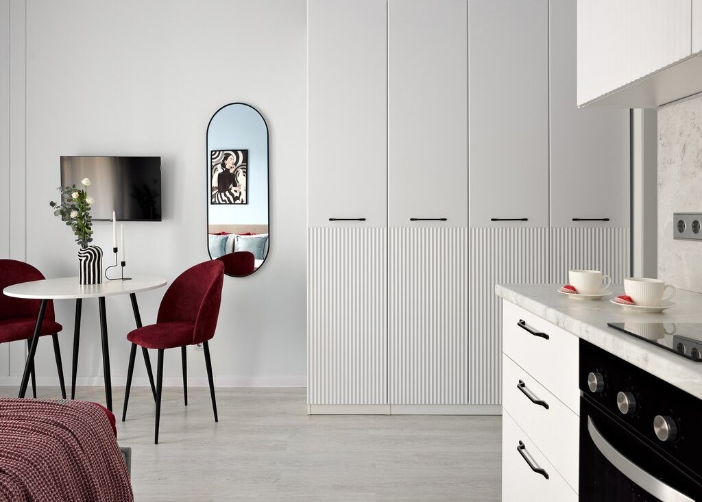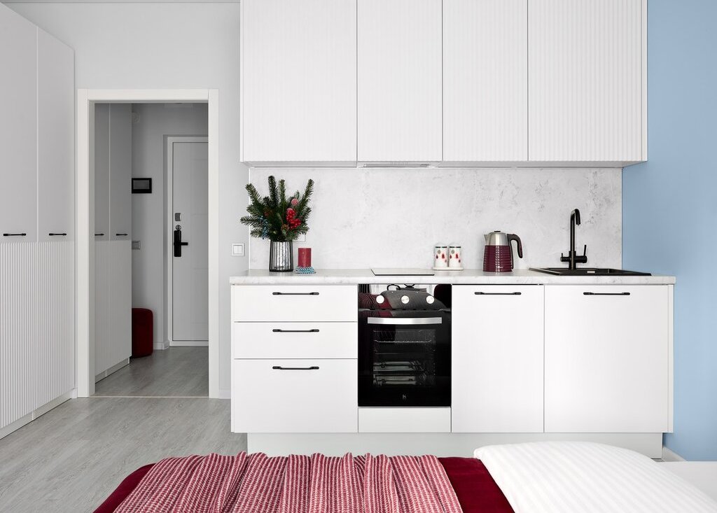 - Кухонный гарнитур, включающий в себя холодильник, плиту, духовой шкаф, посудомоечную машину, электрический чайник, встроенный фильтр с чистой питьевой водой, а также всю необходимую посуду