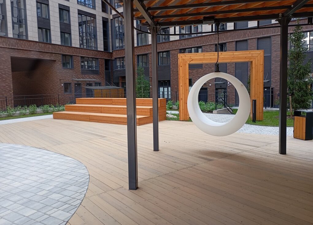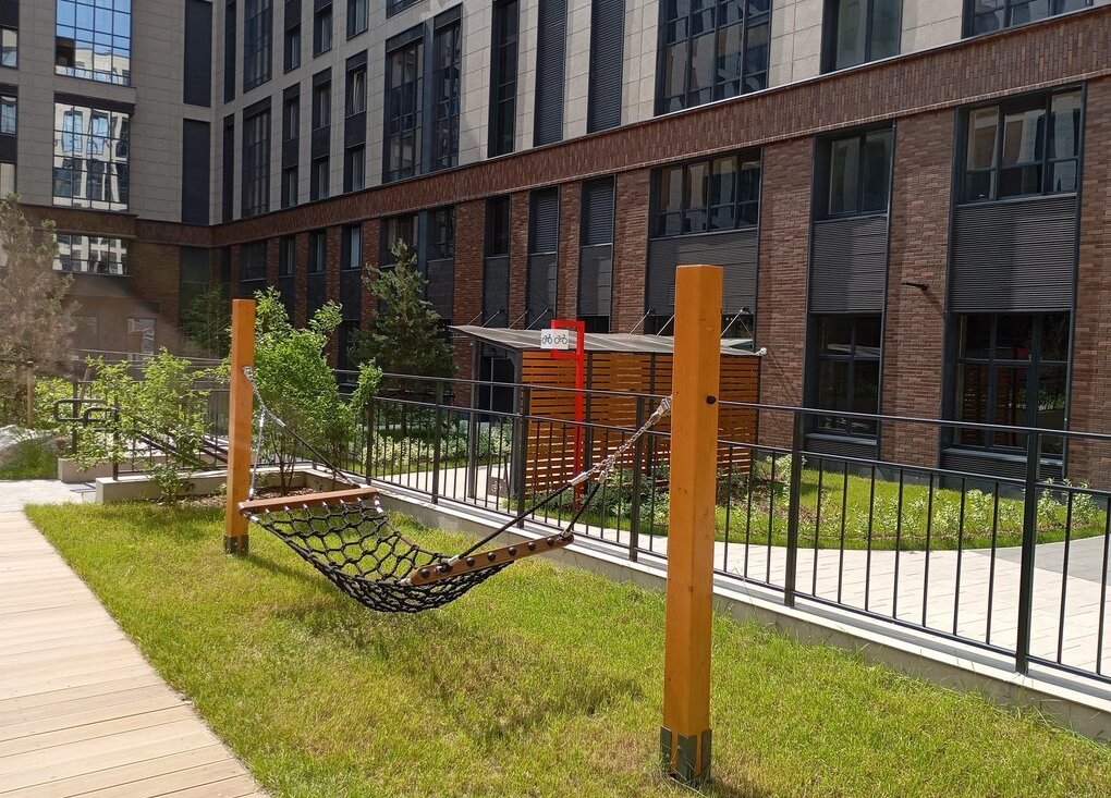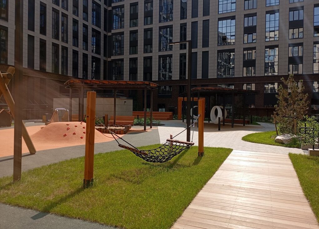 -В центре двоа поднятая на уровень второго этажа зона с детскими площадками, газоном, гамаками, перголой, светящимися качелями ( стильные качели-кольца для взрослых).