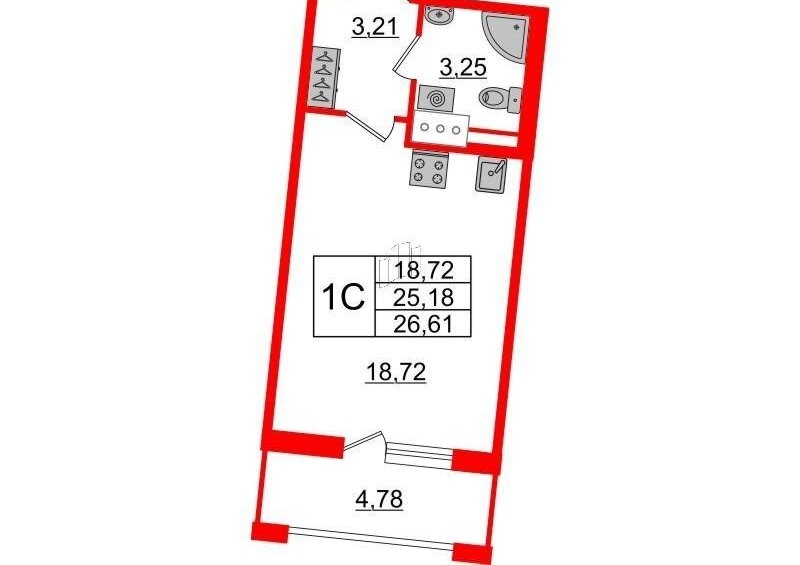 - Плoщaдь - 25.2 кв.м. ( комната 19 кв.м) + лоджия 4,78 кв.м. ( это большая студия с удобной планировкой)