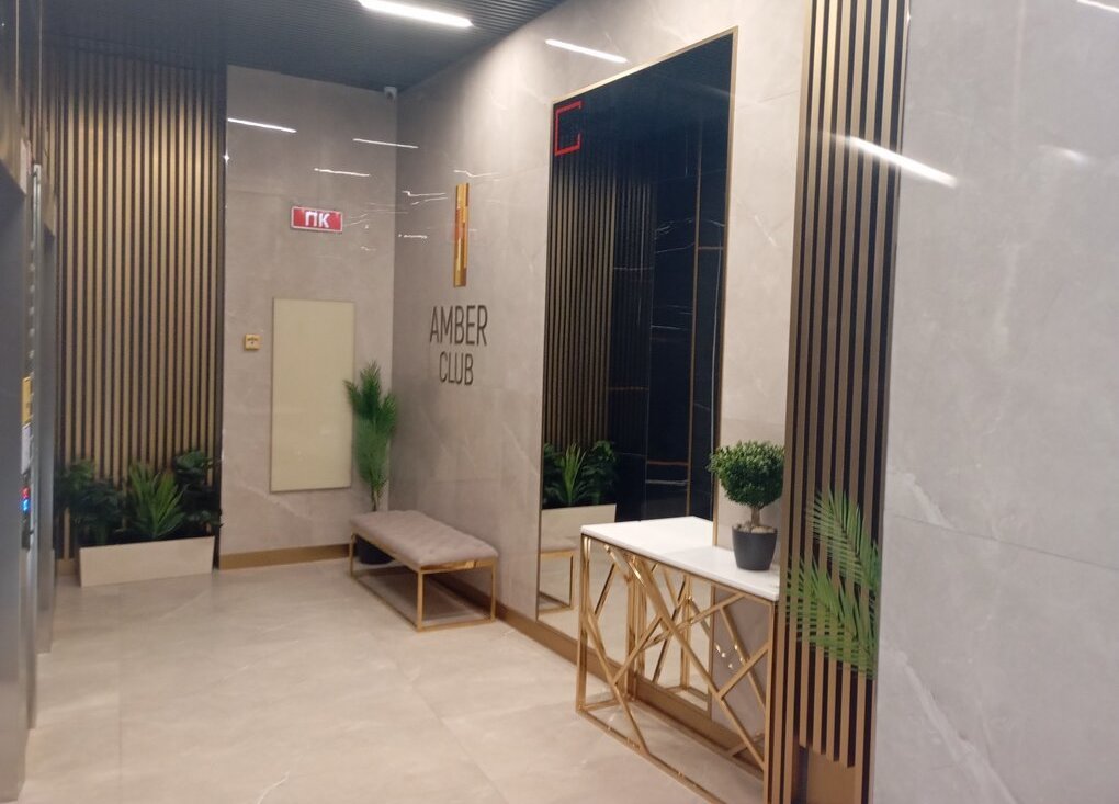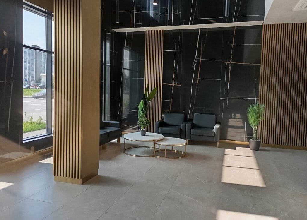 - Вход на территорию через большое дизайнерское лобби с мягкими креслами, биокамином, стойкой консьержа,