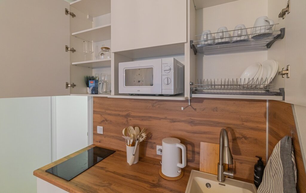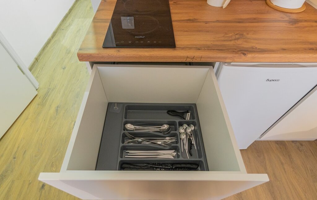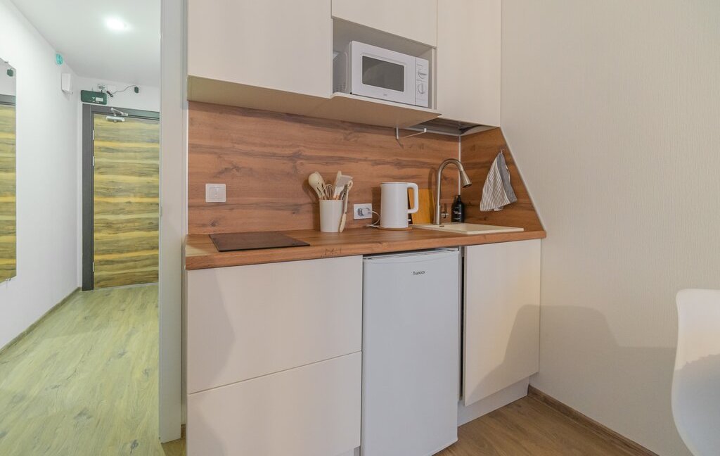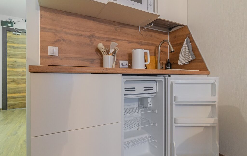 - обеденная зона (холодильник, чайник, микроволновка, плита, столовая группа, посуда на 2 персоны, стол со стульями)