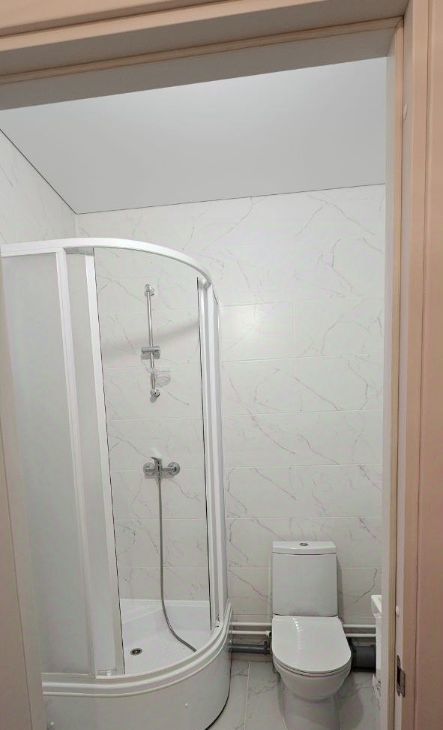 Совмещенный санузел: душевая кабина, сантехника, подвесная тумба с умывальником и зеркало, теплый пол.