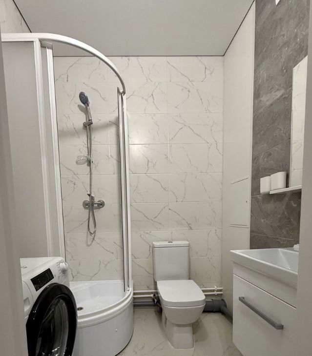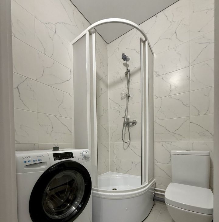 Вся мебель и техника новая: холодильник, плита с духовым шкафом, микроволновая печь, чайник, телевизор, стиральная машина.