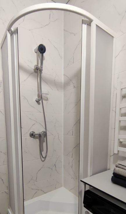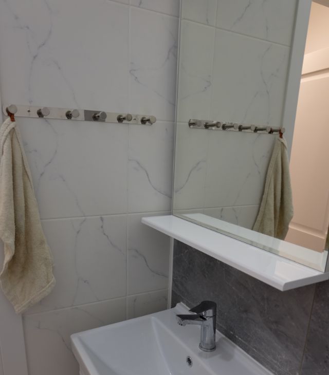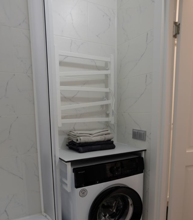 Ванная - пол с подогревом, над стиральной машиной столешница.