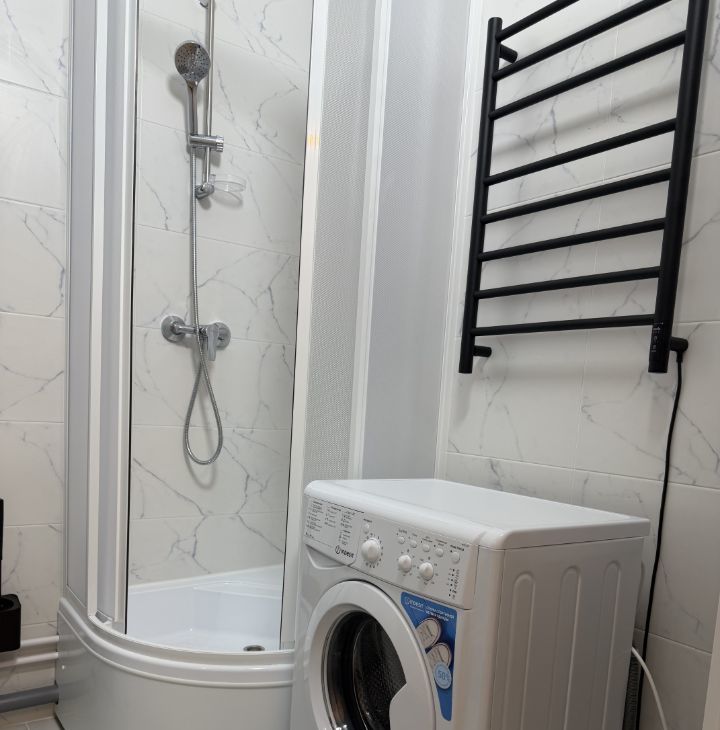 Санузел в кафеле, душевая кабина, унитаз, раковина, зеркало с полкой , стиральная машинка Indesit с загрузкой до 5 кг, большой полотенцесушитель, вместительная корзина для белья, теплый пол с терморегулятором.