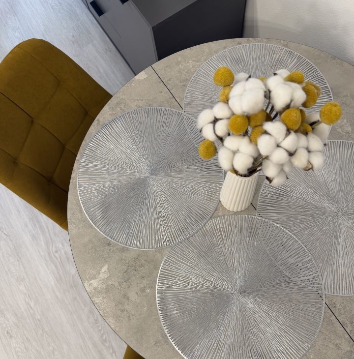 В зоне приема пищи большой стол диаметром 90( с возможностью увеличения его размера до 120см) и 2 мягких стула со спинками.
