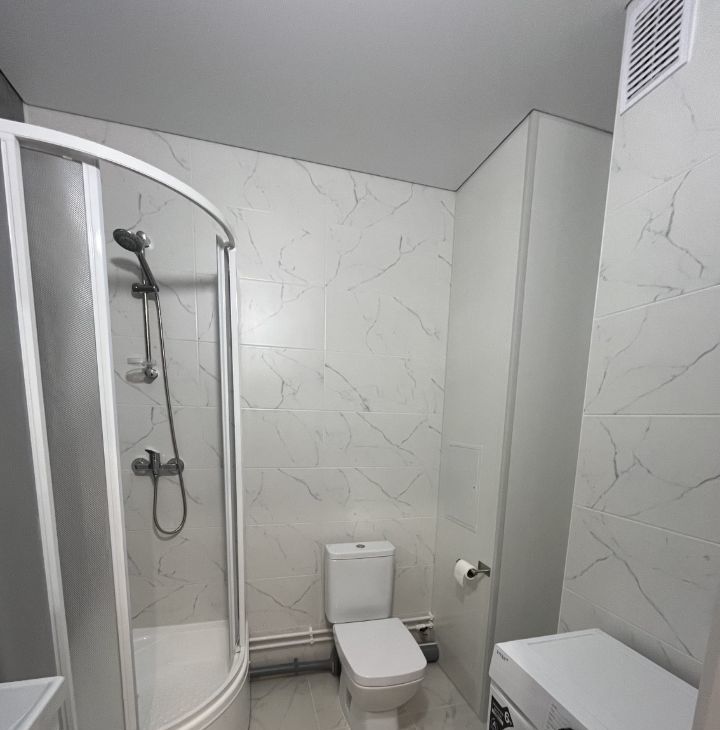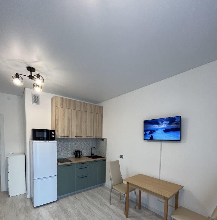 - Полный набор техники: стиральная машина, чайник, холодильник, электрическая плита, микроволновая печь, вытяжка, телевизор.