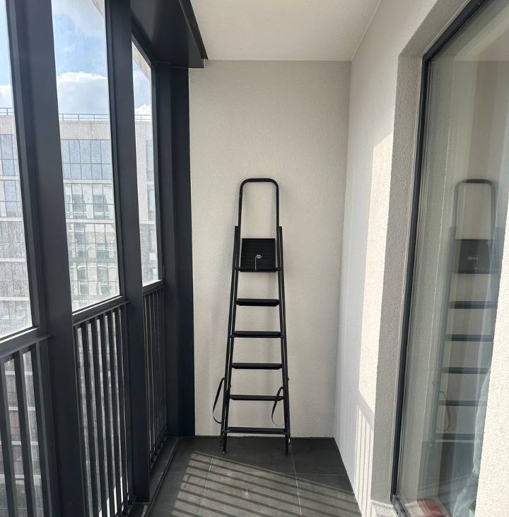 Лоджия 5кв.м. Окна в пол, смотрят во двор. Солнце в квартире после полудня