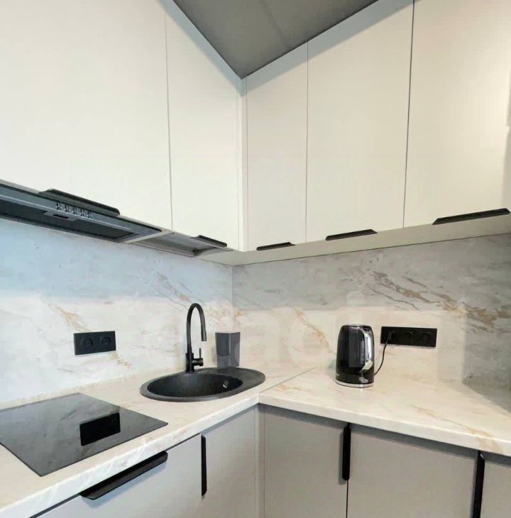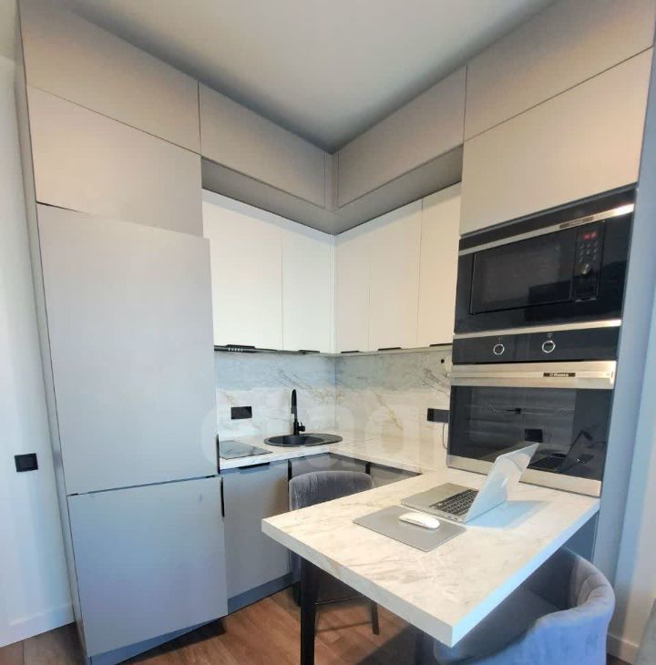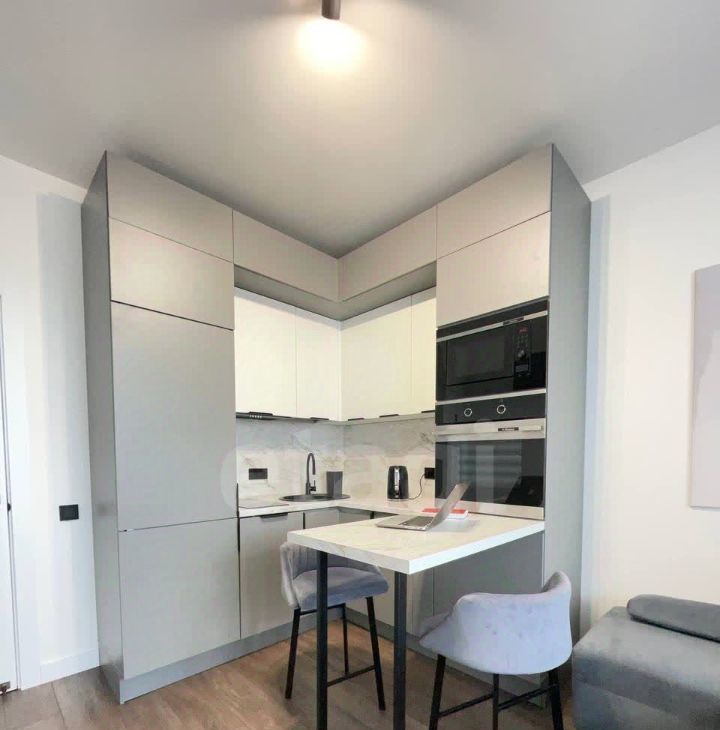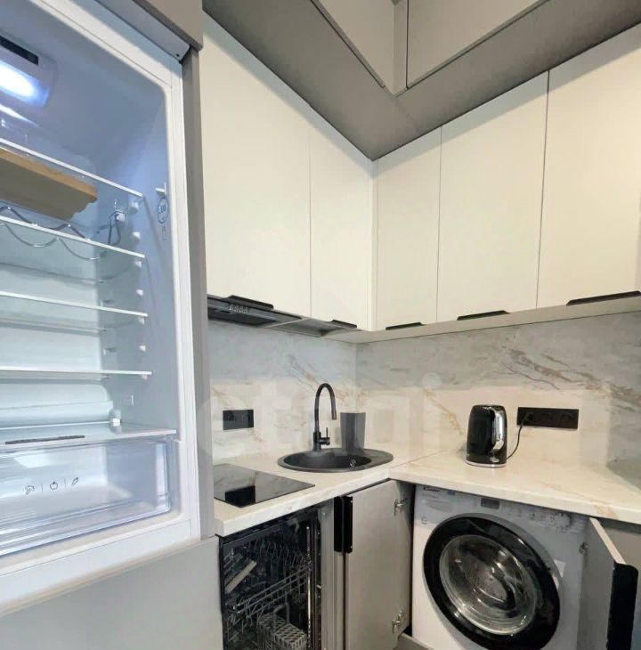 • Встроенная техника: духовой шкаф, варочная панель, СВЧ, холодильник, посудомойка и стиральная машина — всё для вашего удобства