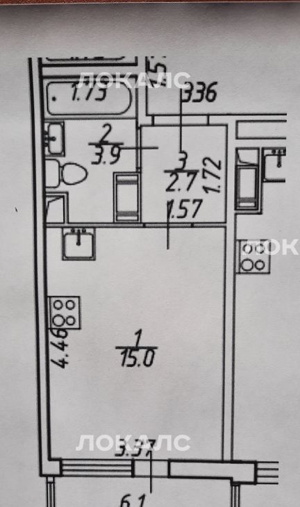 Квартира 23.34 кв.м (15 м комната, 3,9 м санузел, 2,7 м прихожая, 6 м застекленный широкий балкон).