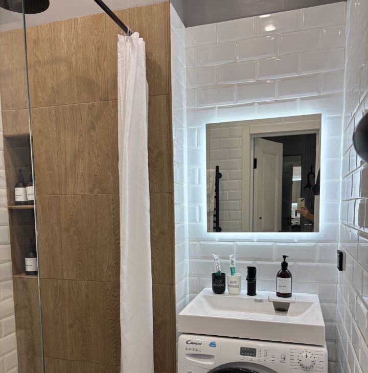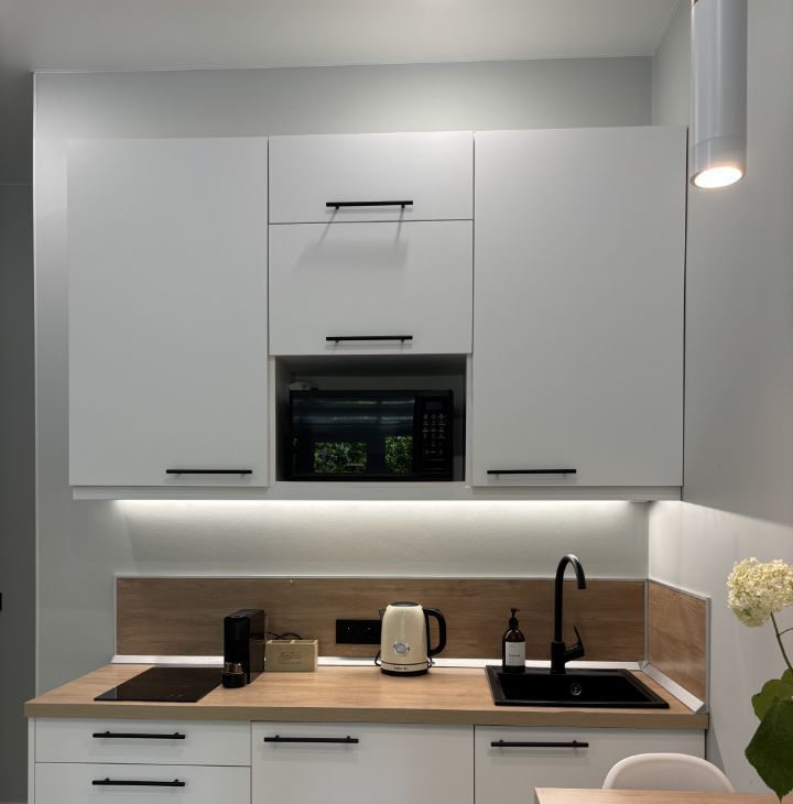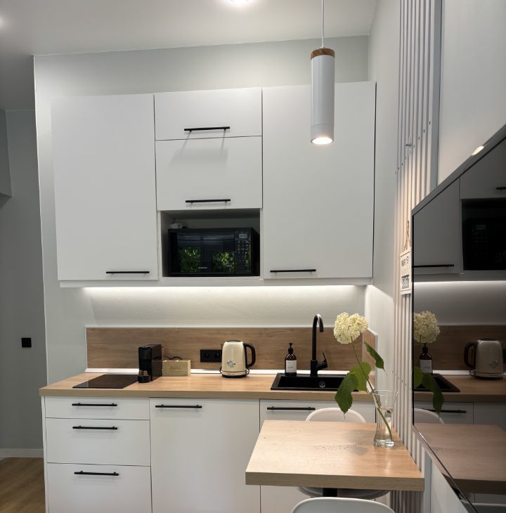 Есть все необходимое: посуда, микроволновка, мини-холодильник, стиральная машина. В с/у теплый пол.