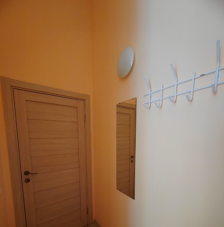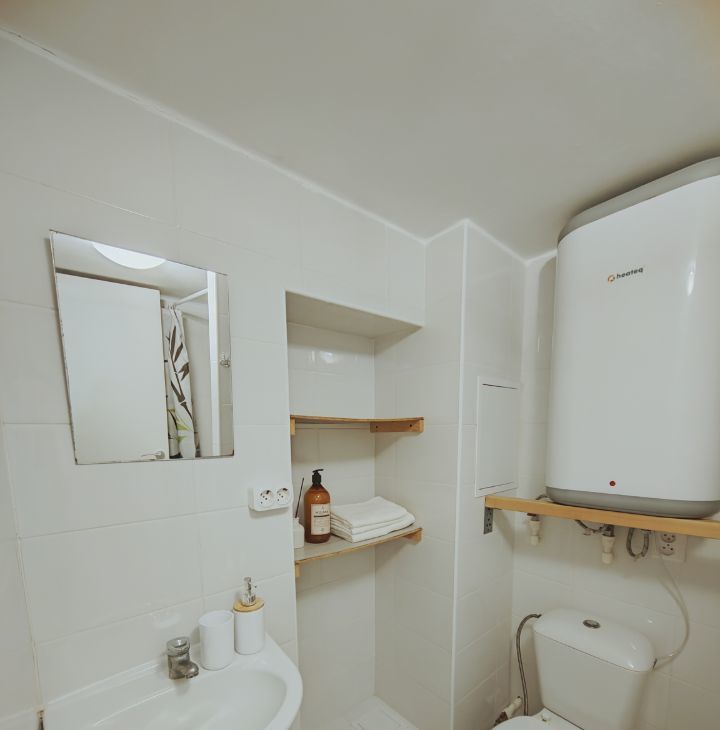 В студии совмещен санузел и душевая, на случай отключения горячей воды установлен бойлер.