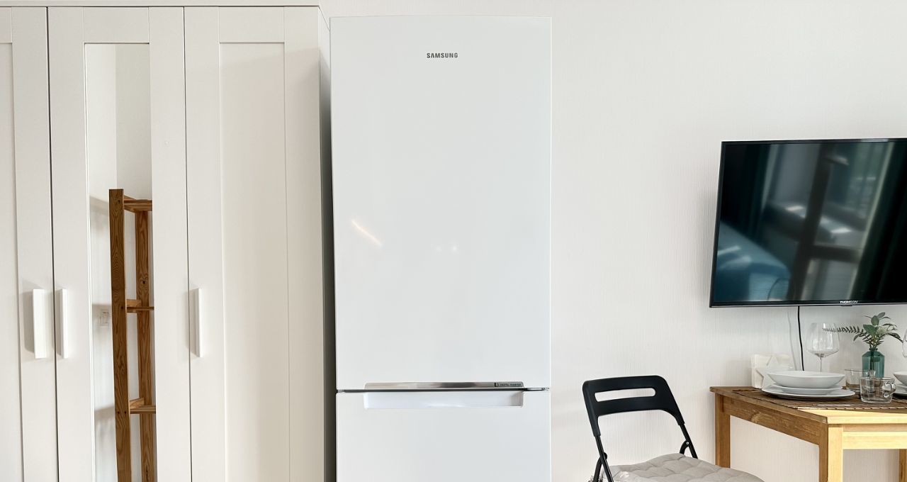 - УДОБНАЯ КУХНЯ со всей нужной техникой (холодильником SAMSUNG, индукционной плитой, микроволновкой, чайником с регулировкой температуры), а также посудой для готовки, приёма пищи и приборами;
