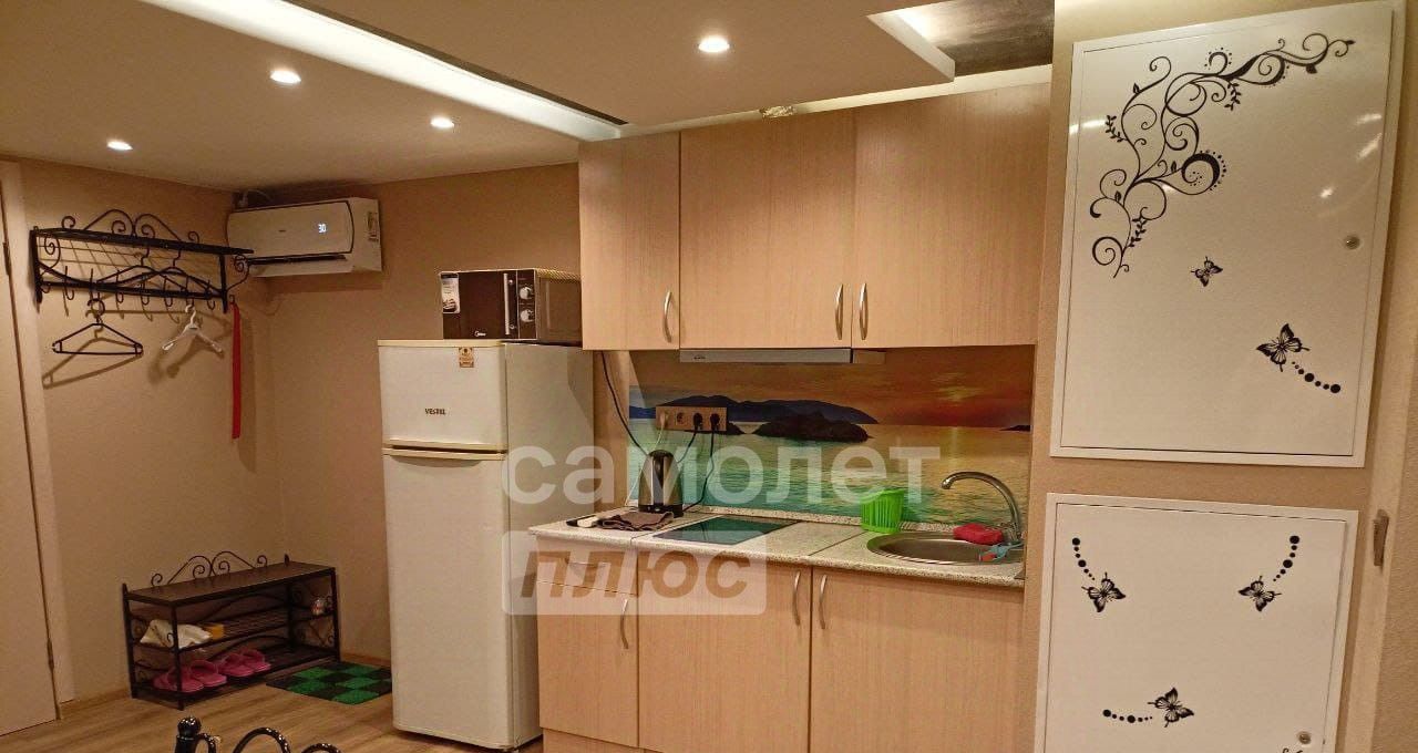 У квартиры свой собственный вход. При входе в квартиру с левой стороны расположены крючки для ваших вещей и обувница. Далее мы проходим в основную комнату, где с левой стороны установленная кухонная зона с варочной панелью, встроенной духовкой, есть холодильник. С правой стороны двуспальная кровать. Напротив кровати расположен диван и телевизор.