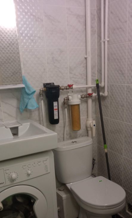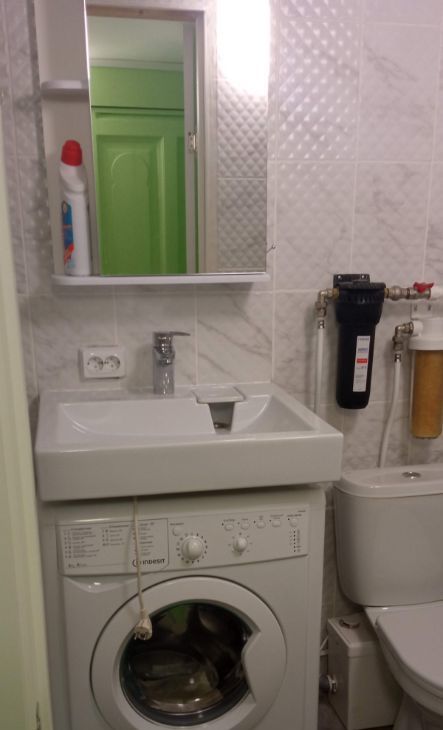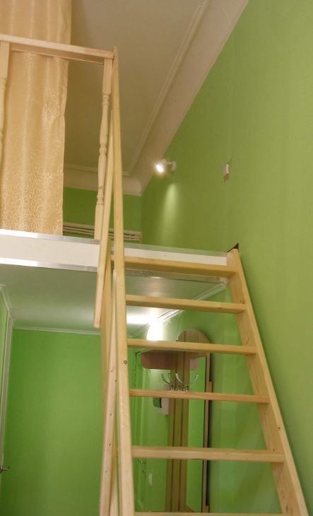 Есть все необходимое для жизни: спальное место на втором ярусе, шкаф, кухонный гарнитур, стол, стулья, электроплитка, плитка, микроволновка, холодильник, чайник, утюг и гладильная доска, сушилка, стиральная машина. Свой санузел с ванной. Высота 2-го яруса 1,6 м.