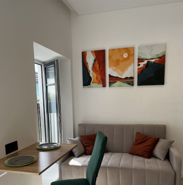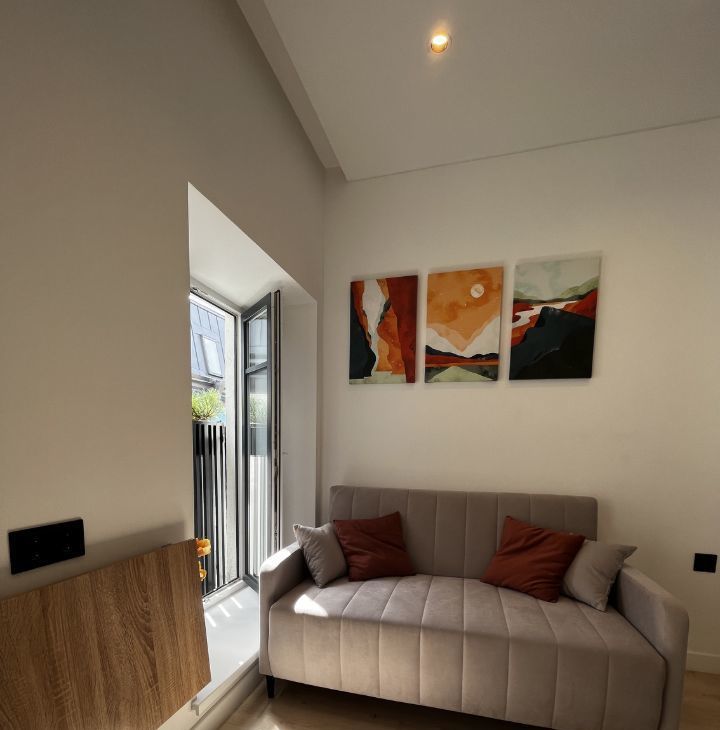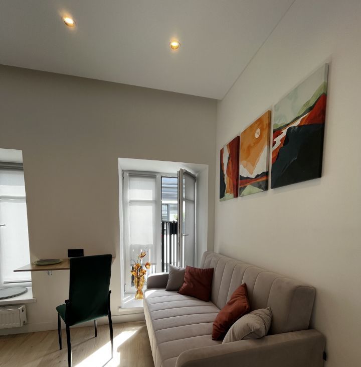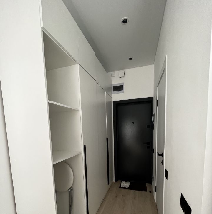 Входная дверь с отличной звукоизоляцией. Раскладной диван двухместный scandica matias. Вместительный шкаф под потолок с полками и штангами для верхней одежды.