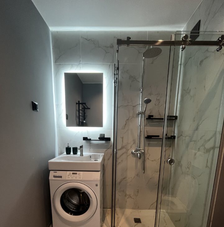 Выполнен качественный ремонт, установлена новая мебель и техника: в ванной стиральная машина Haier, электрический полотенцесушитель с таймером, зеркало с подсветкой; на кухне вместительный холодильник beko, мощная вытяжка kuppersberg и электрическая плита, микроволновка gorenie, чайник.