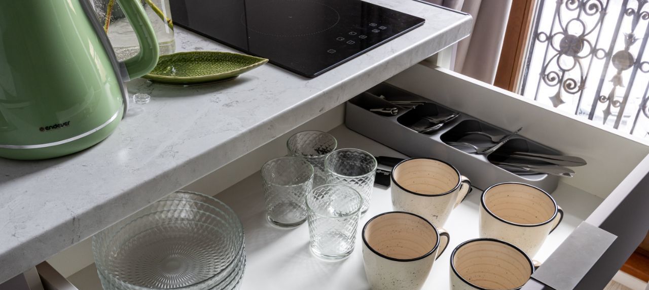 Техника: Холодильник, варочная панель, СВЧ-печь, стиральная машина, электрочайник.