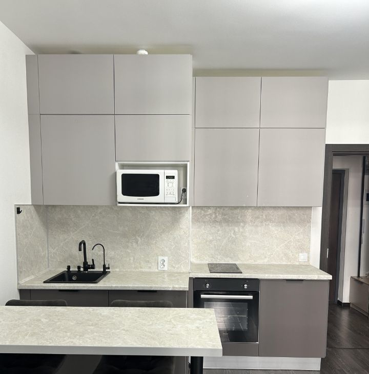 Укомплектованная кухня: плита, духовой шкаф, холодильник, микроволновка, сушилка для посуды
