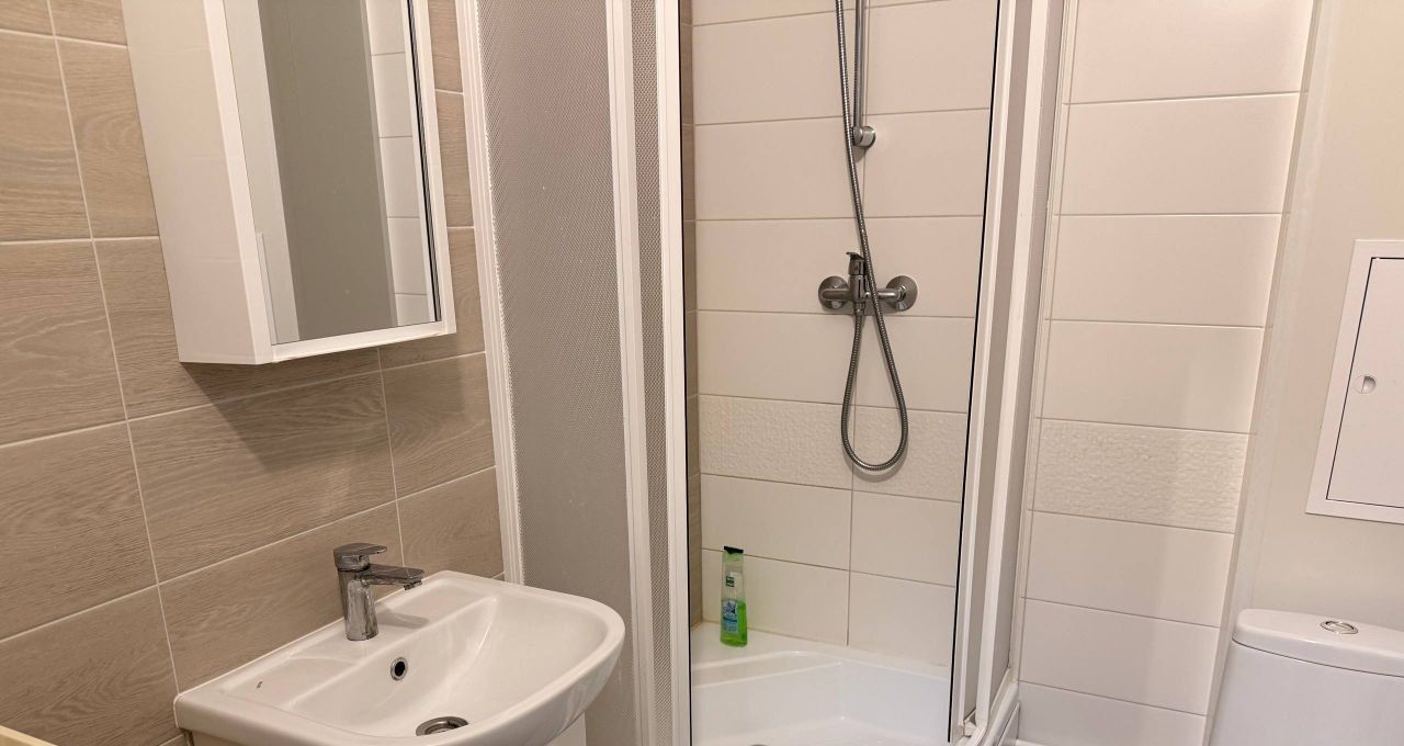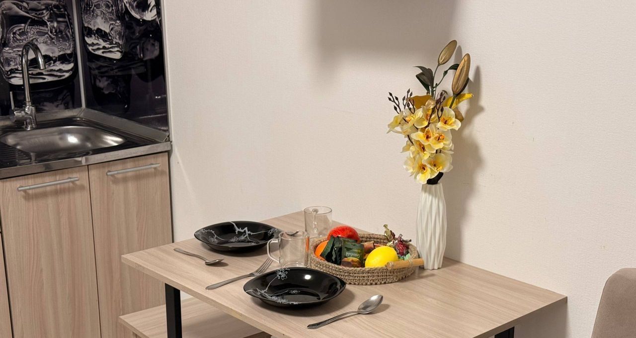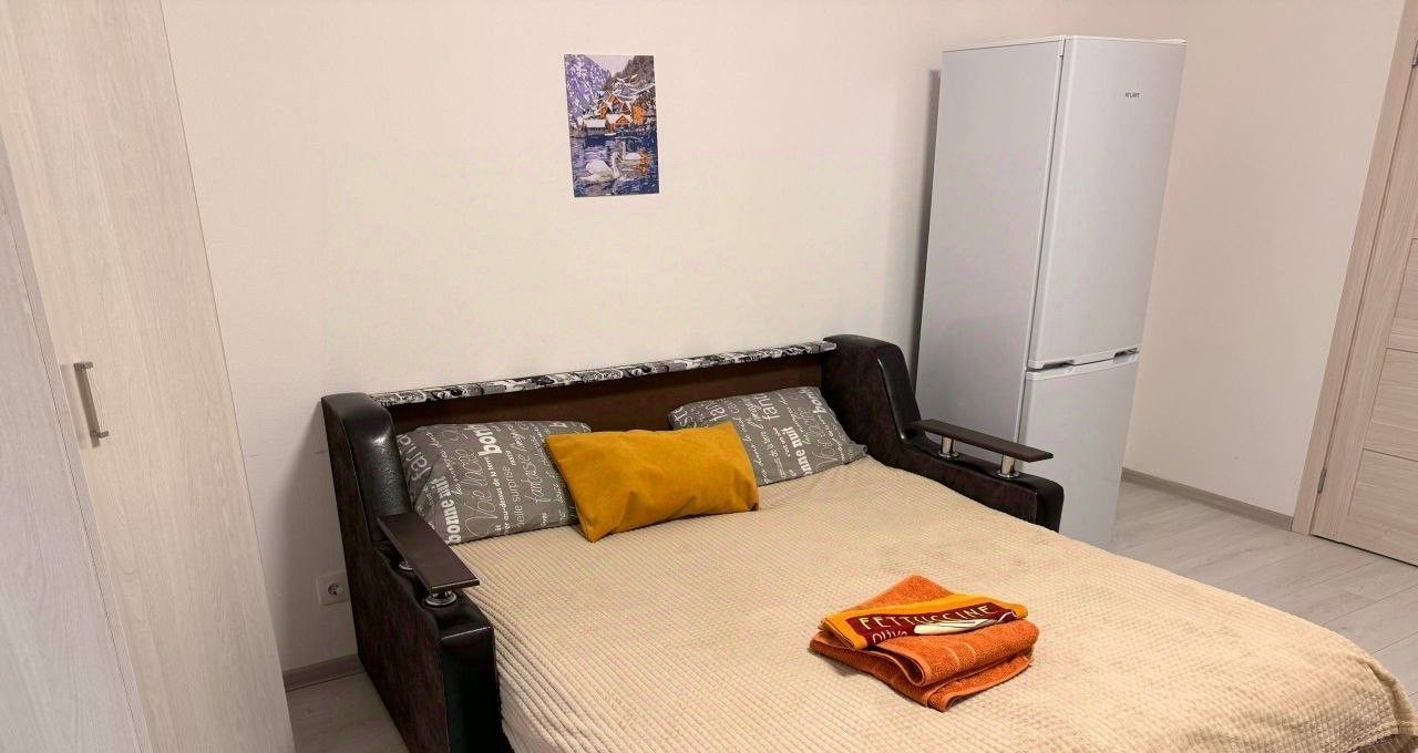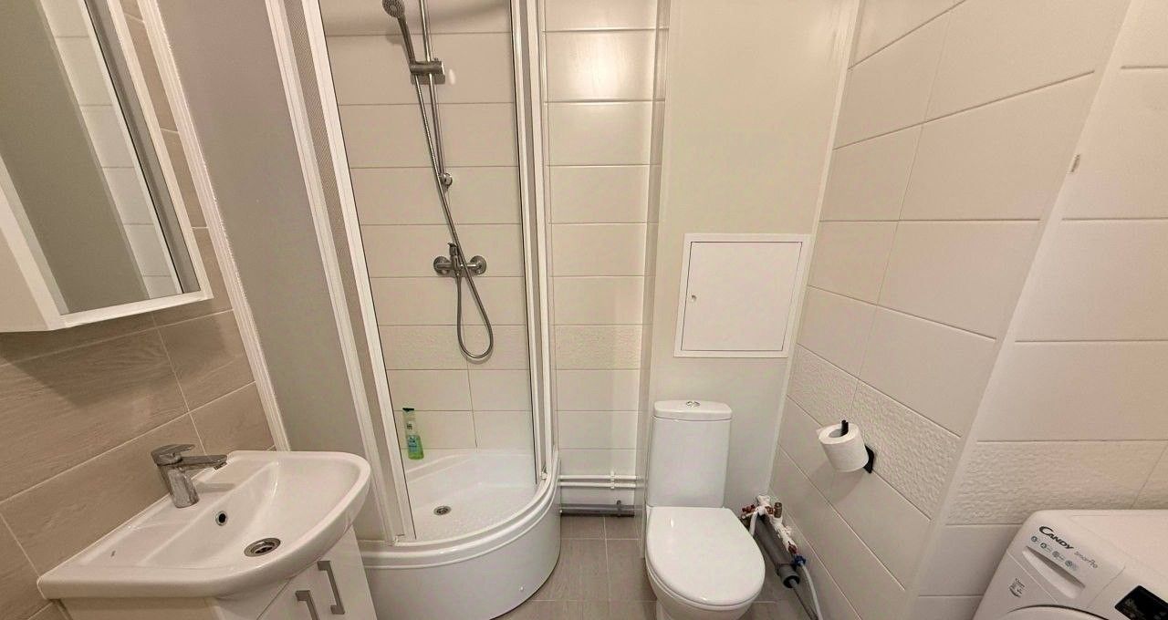Квартира полностью меблирована: в комнате и на кухне есть вся необходимая мебель. Из техники — холодильник и стиральная машина. В совмещенном санузле установлена душевая кабина. Уютная лоджия добавляет дополнительные возможности для отдыха и хранения вещей. Также в квартире есть подключение к интернету.