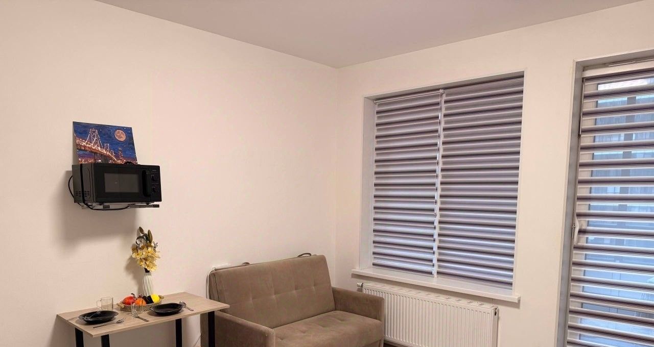 Сдается уютная студия в новом доме с современным евроремонтом. Общая площадь квартиры составляет 27 кв. м, жилая — 22 кв. м, кухня — 5 кв. м. Расположена на 3 этаже 14-этажного монолитно-кирпичного дома 2022 года постройки. Высота потолков — 2.77 метра, окна выходят во двор, поэтому в квартире всегда будет тихо и спокойно.