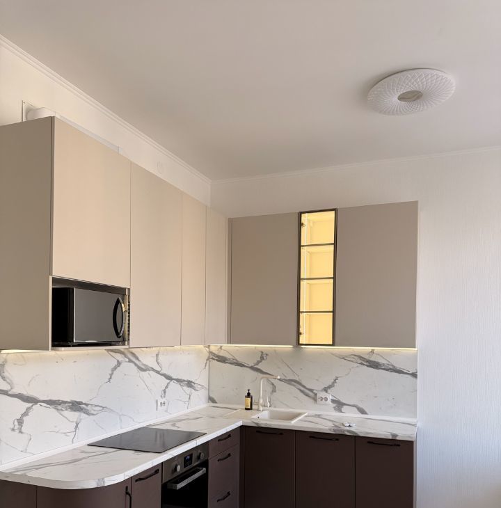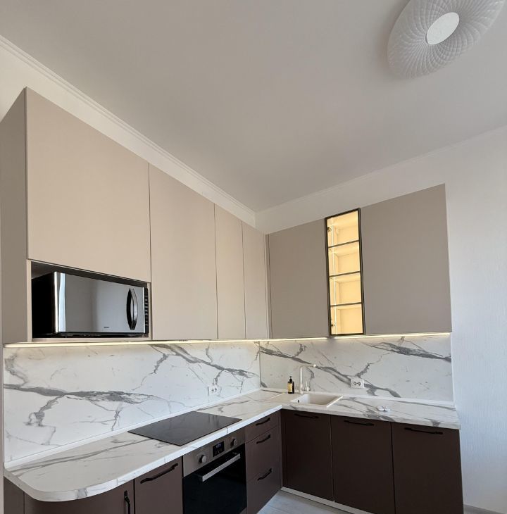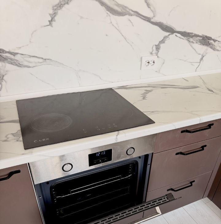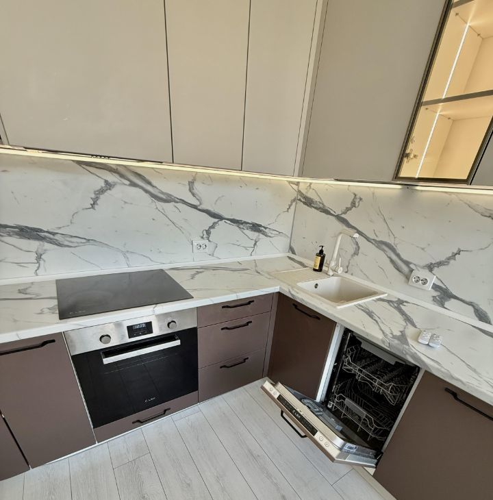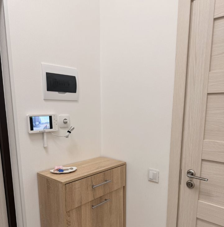 установлен видеодомофон. Современная кухня с полным набором встроенной техники: микроволновая печь, варочная панель, духовой шкаф, посудомоечная машина, смеситель с фильтром для питьевой воды.