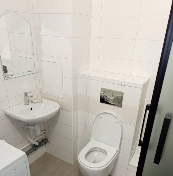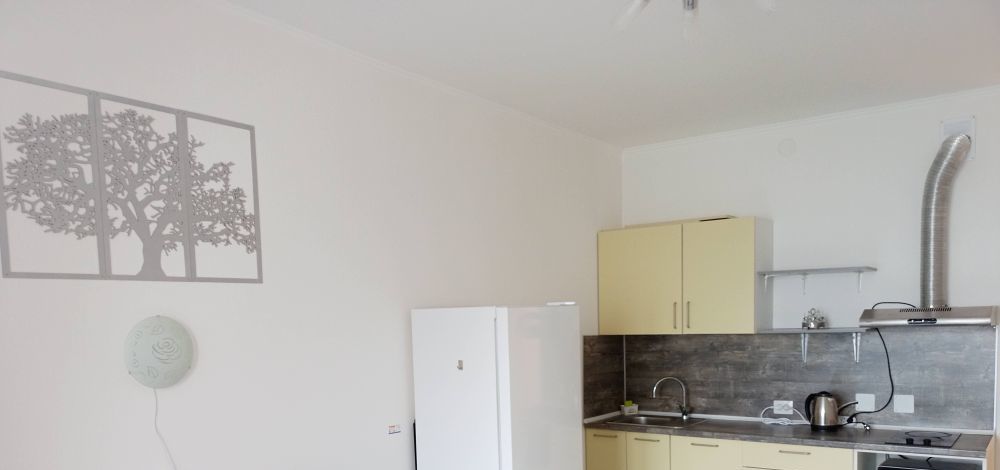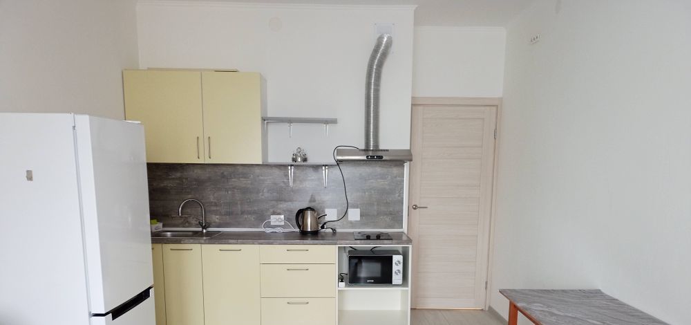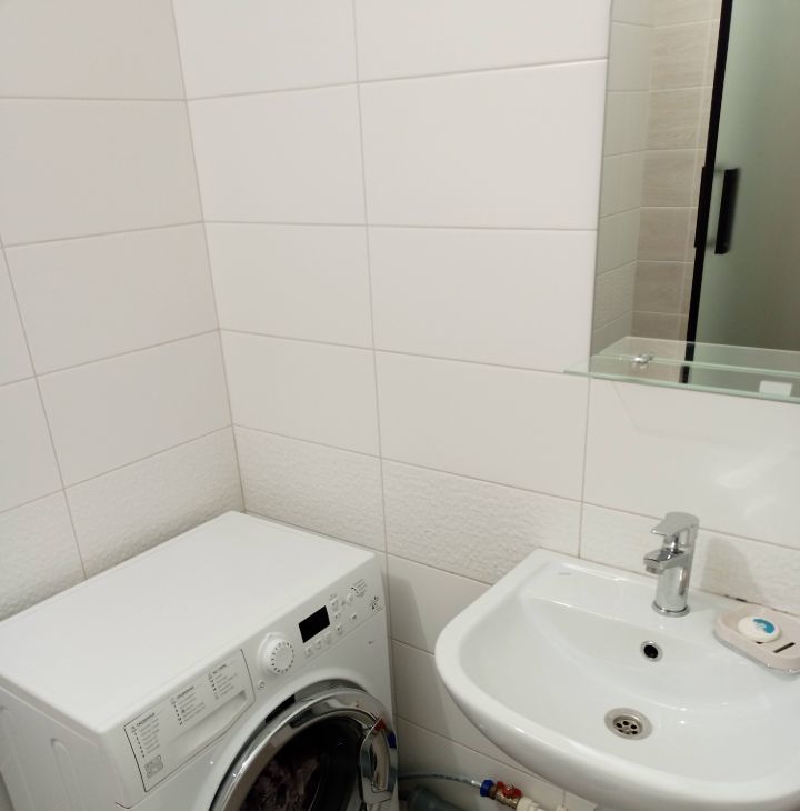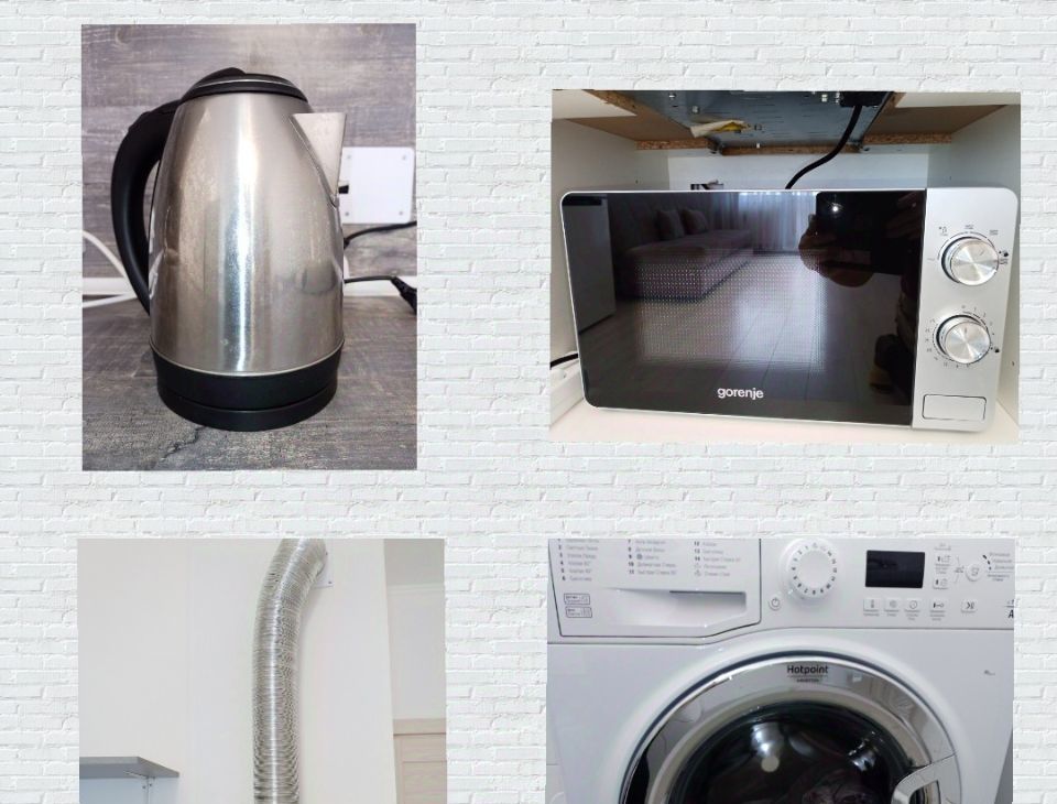 • Оборудована необходимой бытовой техникой: стеклокерамическая поверхность, холодильник Indesit, новая вытяжка DEXP, микроволновка gorenie, стиральная машина Hotpoint-Ariston 6кг, чайник, минимальный набор посуды.