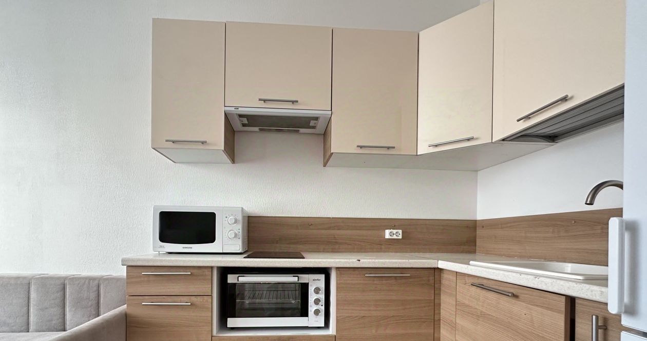 Кухня: полноценный гарнитур, варочная панель, электрическая духовка, микроволновая печь, большой холодильник, стиральная машина.