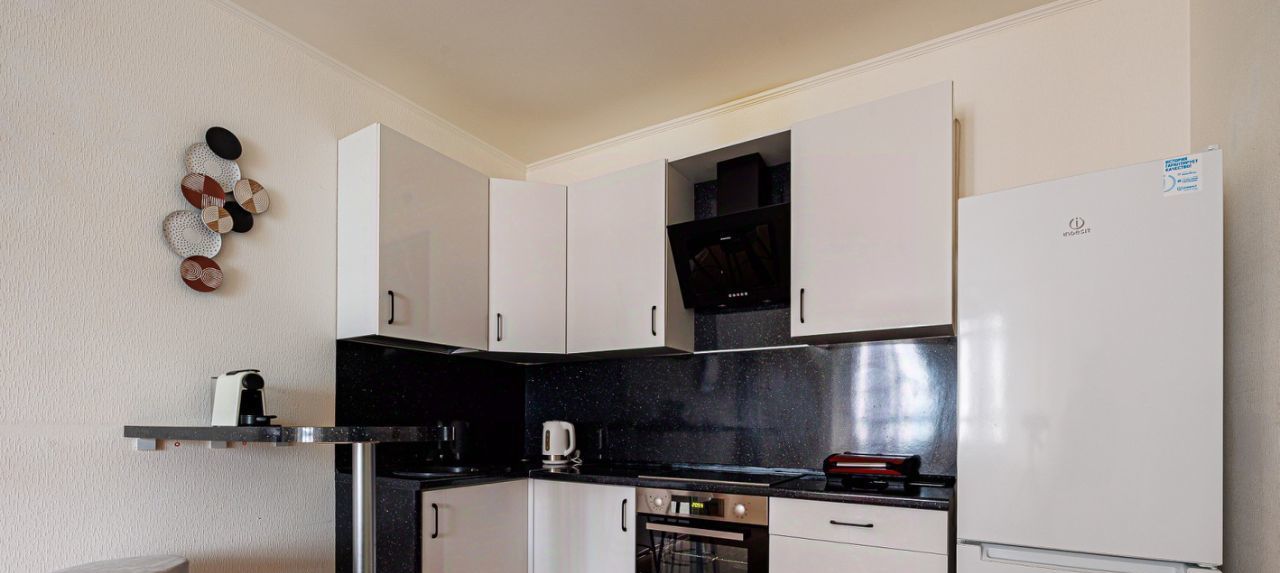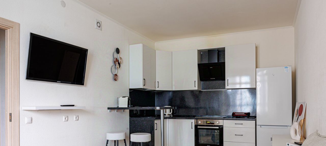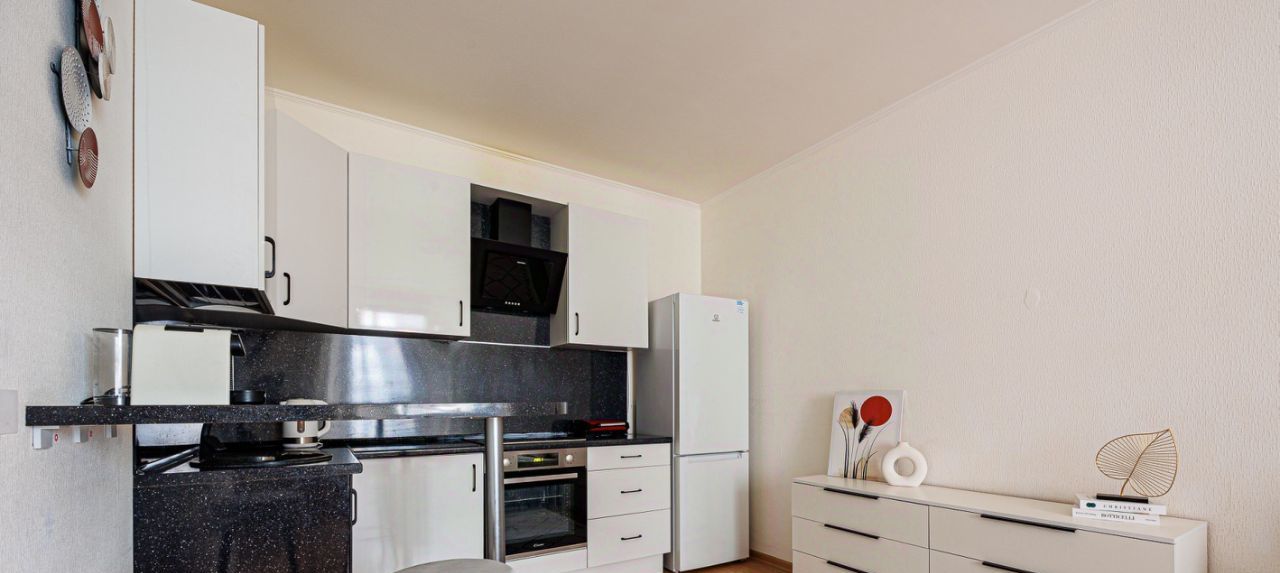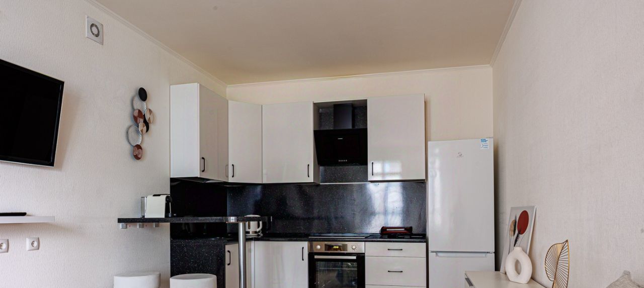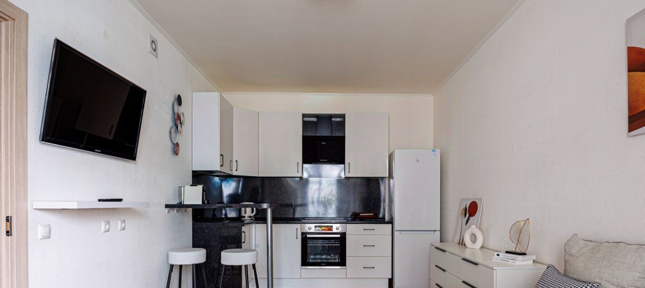 Квартира укомплектована всей необходимой мебелью и техникой: холодильник, стиральная машина, кофемашина, встроенные варочная поверхность и духовой шкаф, телевизор и электрогриль. Что важно есть двуспальная кровать с хорошим матрасом для комфортного сна. Полноценная ванная, а не душевая кабина, что редкость для студий) Очень уютная обстановка, множества мест для хранения вещей, в коридоре огромный вместительный шкаф-купе, письменный стол и барный стол со стульями. Приятный вид с лоджии на благоустроенный двор .