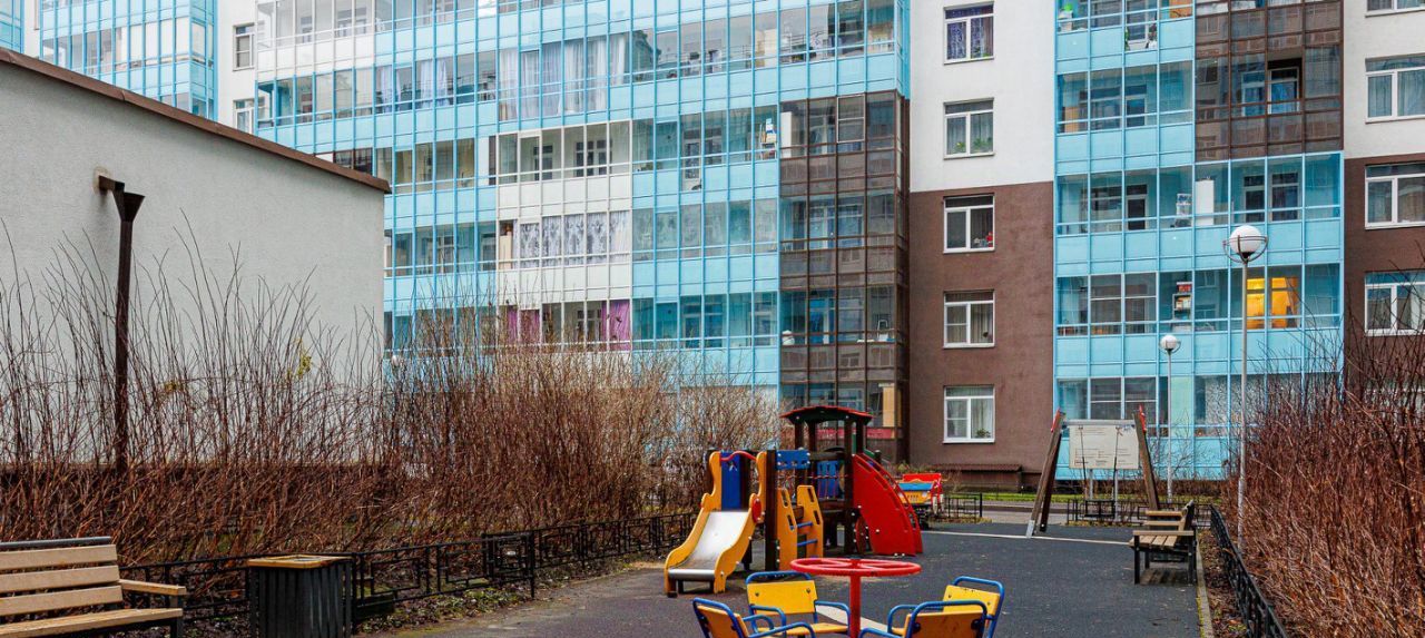 Двор с детской площадкой и зоной для активного спорта. Система видеонаблюдения для безопасности жителей.