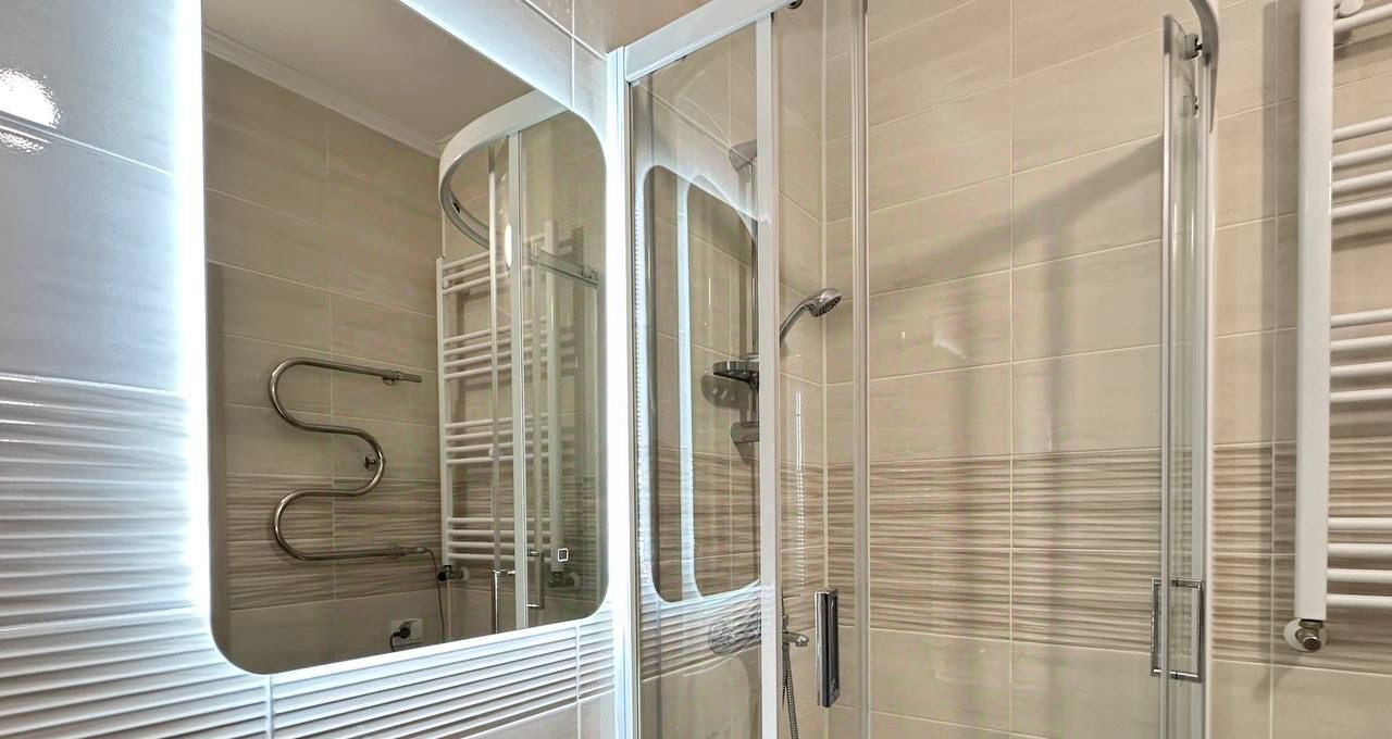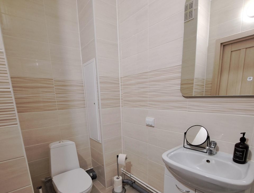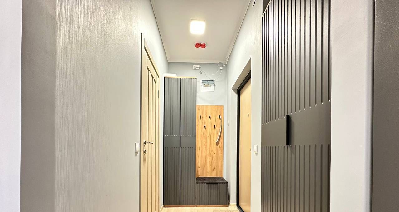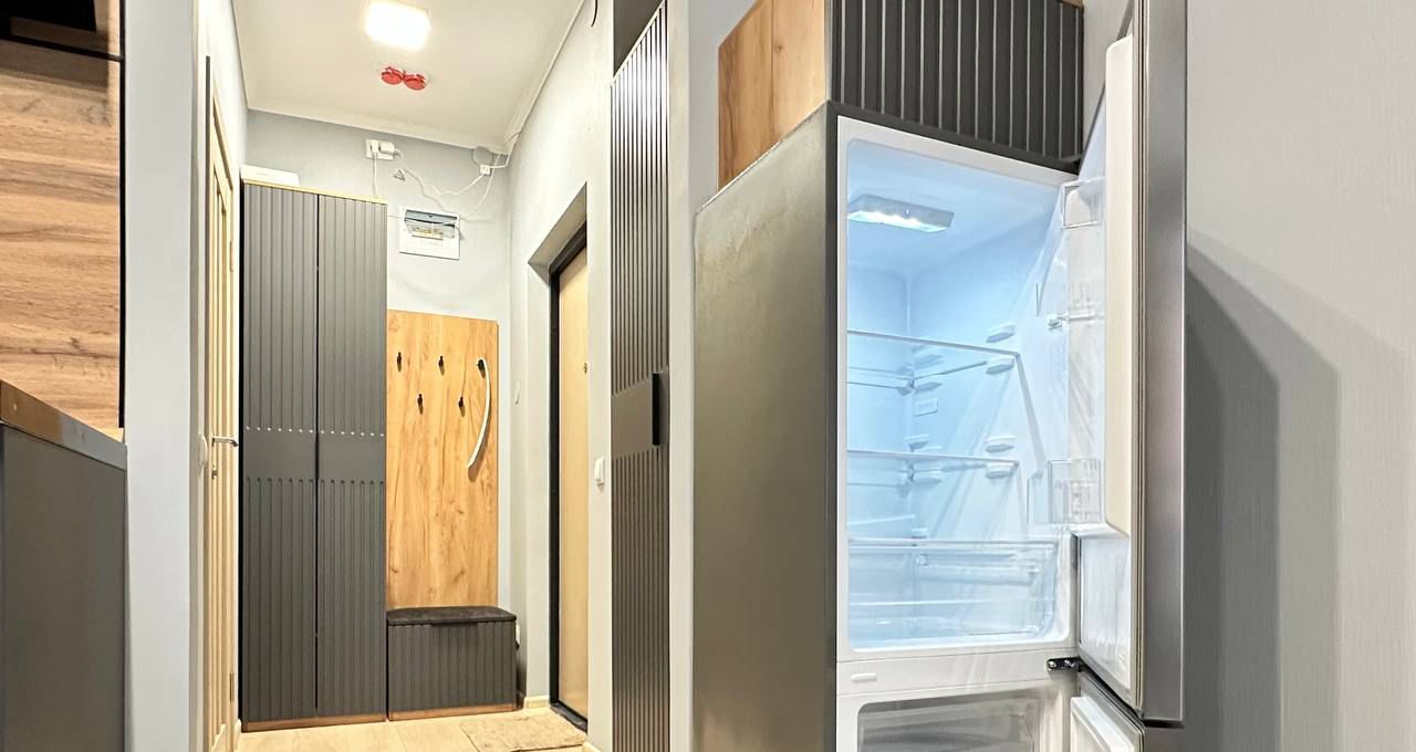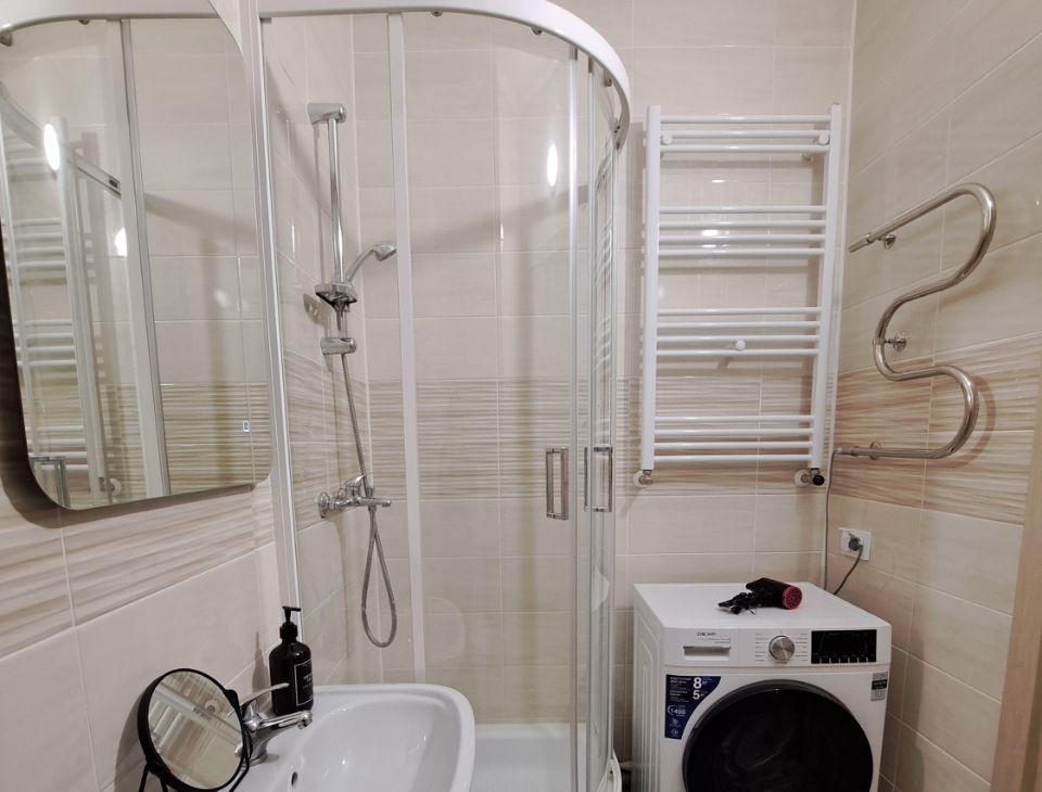 Квартира имеет дизайнерский ремонт, что придаёт ей современный и уютный вид. В студии есть всё необходимое для комфортного проживания: на кухне и в комнате установлена мебель, в наличии холодильник, телевизор и стиральная машина. Санузел совмещенный, оборудован душевой кабиной. Также имеется лоджия, где можно отдохнуть после рабочего дня.
