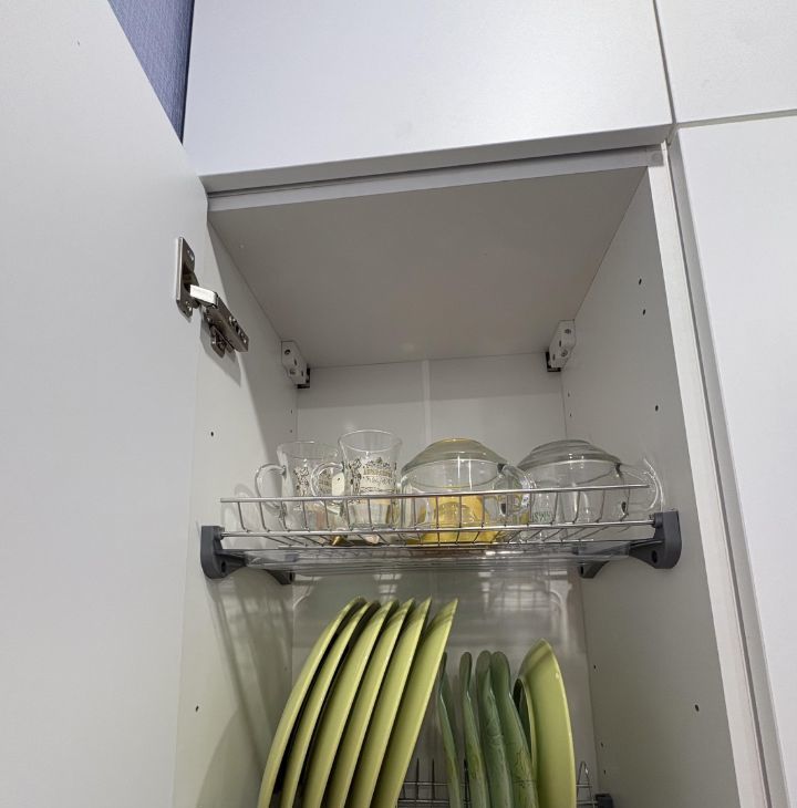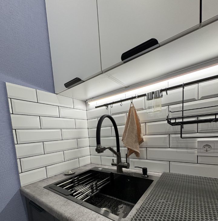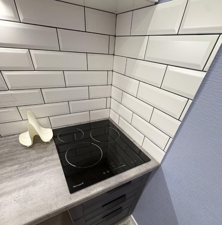 Кухня изолирована от комнаты. Из техники: варочная панель, духовой шкаф, холодильник, чайник. Из мелочей: посуда подлянка приёма и приготовления пищи, столовые приборы и аксессуары.