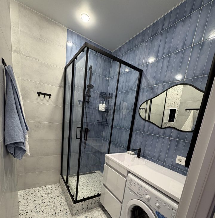 Санузел совмещенный, с душевой кабиной, стиральной машиной. В небольшой прихожей вы комфортно разместите обувь и одежду. Wi-Fi есть.