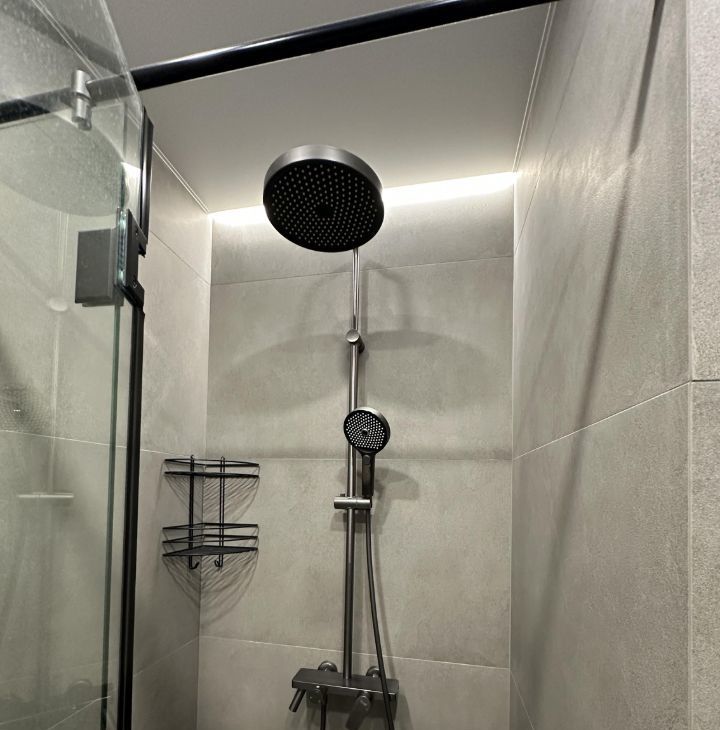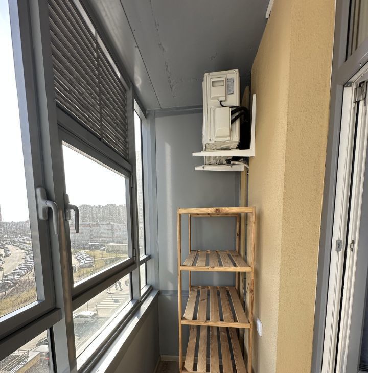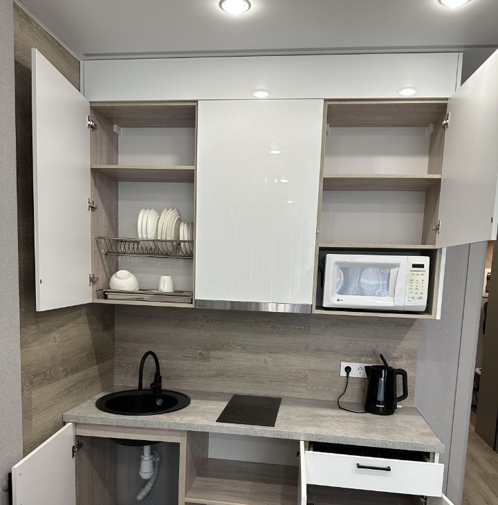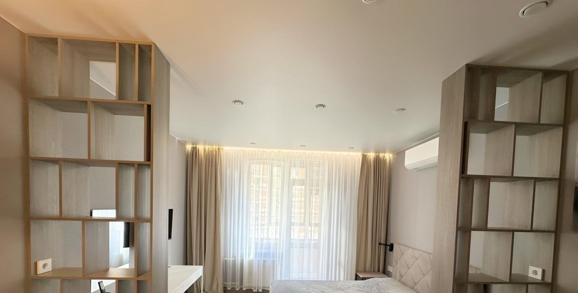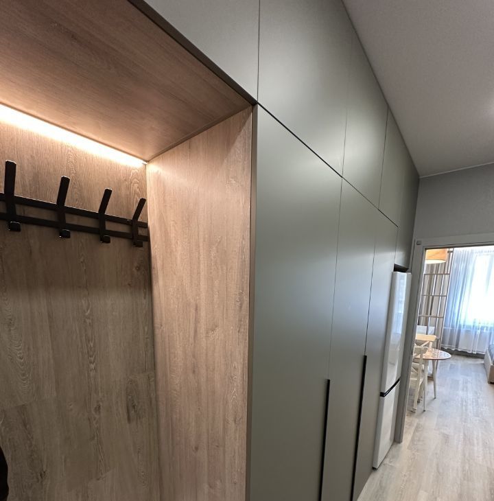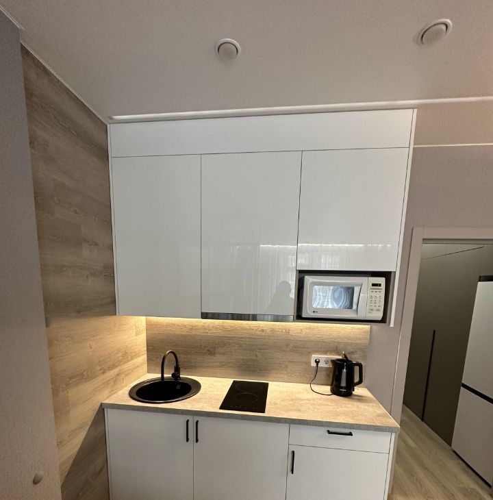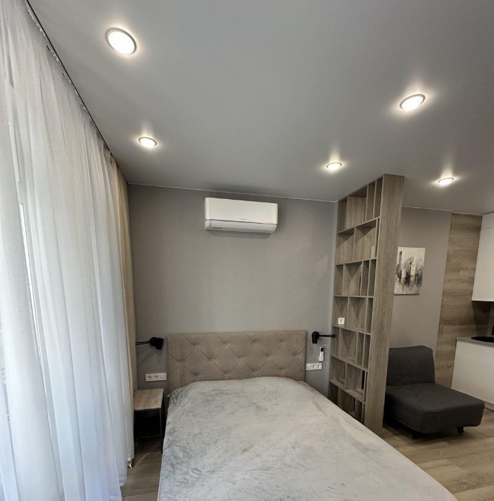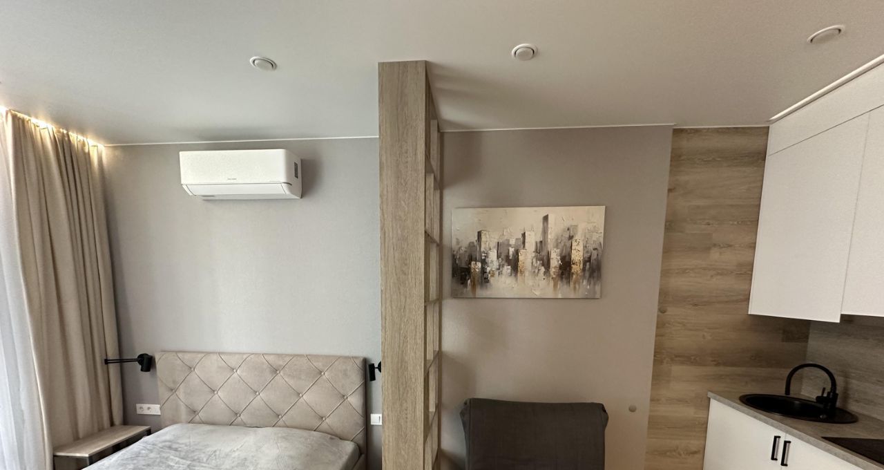 В жилой комнате сделано зонирование с помощью стеллажей на две зоны. Зона кухни - в ней смонтирована сама кухня с электрической варочной поверхностью, микроволновой плитой, вытяжкой, раковиной с гибким смесителем и сушилкой для посуды. Предусмотрена подсветка столешницы. Также в этой части комнаты установлено кресло IKEA, которое при желании можно разложить в спальное место и столик со стульями. Вторая часть комнаты - зона спальни. В ней установлена кровать 160*200см с матрасом, туалетный столик IKEA с креслом, телевизор с WiFi и кондиционер. В комнате сделано много разных зон освещения - от яркого потолочного, до скрытого контурного, если вы хотите расслабиться перед сном. На балконе установлено кресло под ротанг и стеллаж для хранения.