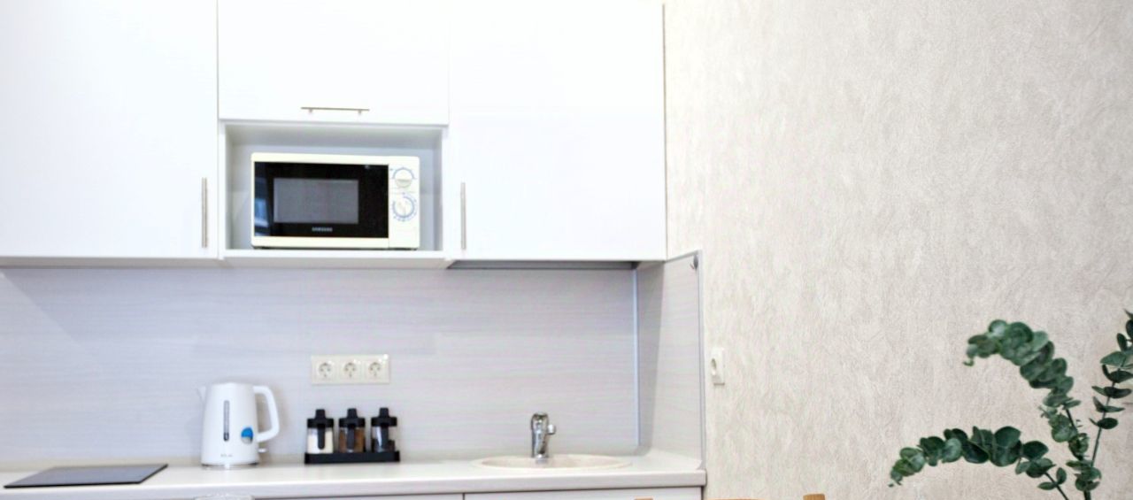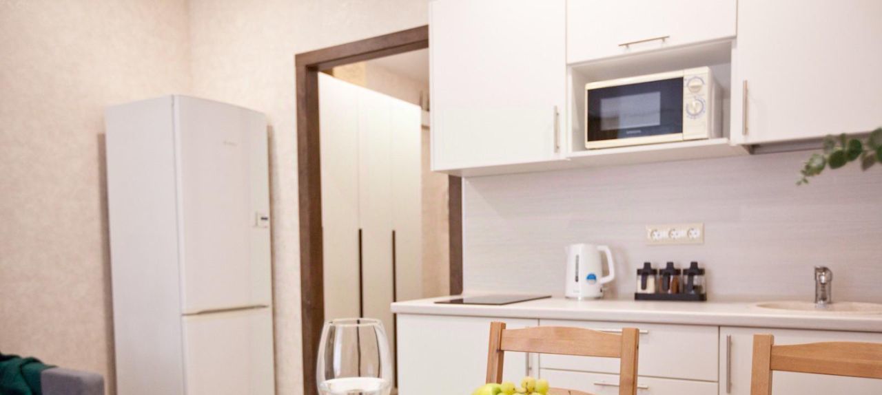 кухня со всей необходимой мебелью и техникой, включая плиту, духовку. холодильник, чайник и свч +посуда и столовые приборы;