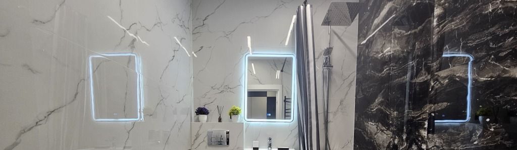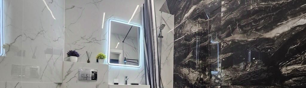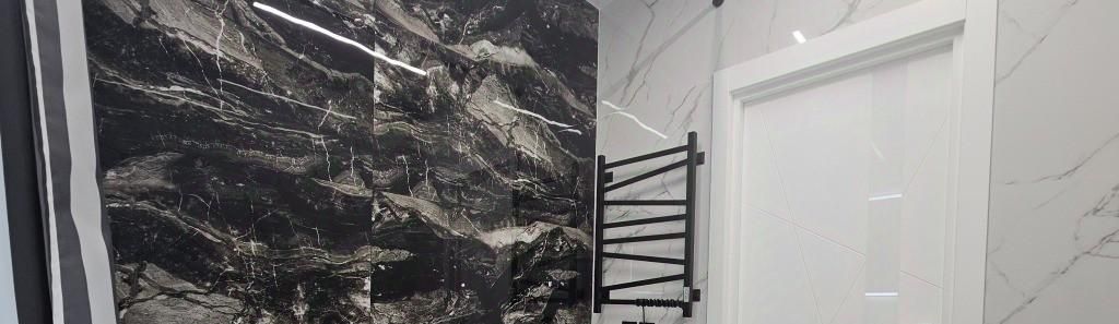 Санузел в современном стиле, с отделкой керамогранит, где разместилась стиральная машина и стильный электрический полотенцесушитель.