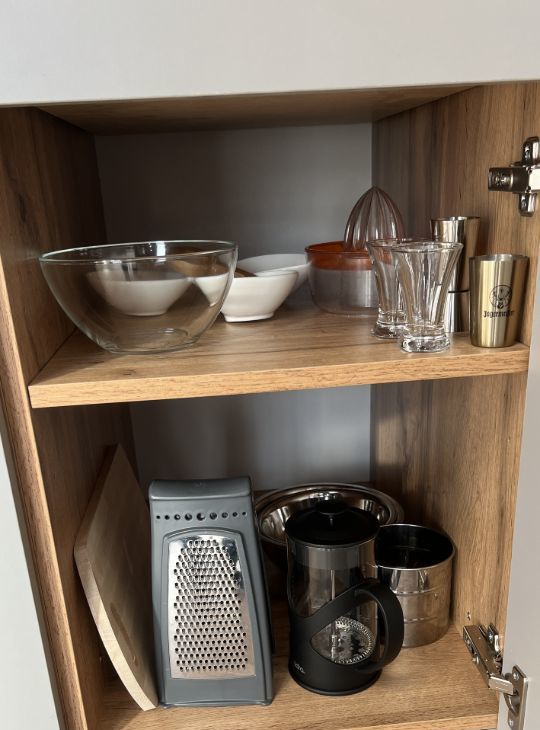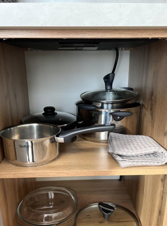 Квартира полностью укомплектована — здесь уже есть всё для комфортной жизни, вплоть до необходимой посуды.
